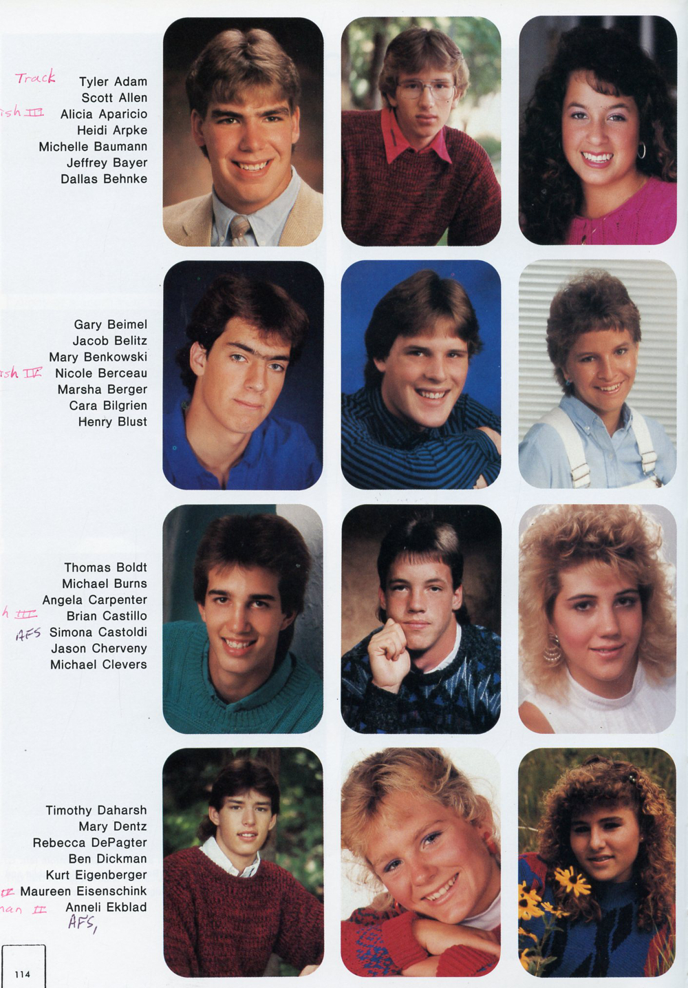 1989 Sheboygan Falls High School Yearbook Page 114: Tyler Adam, Scott Allen, Alicia Aparicio, Gary Beimel, Jacob Belitz, Mary Benkowski, Thomas Boldt, Michael Burns, Angela Carpenter, Timothy Daharsh, Mary Dentz, Rebecca DePagter.