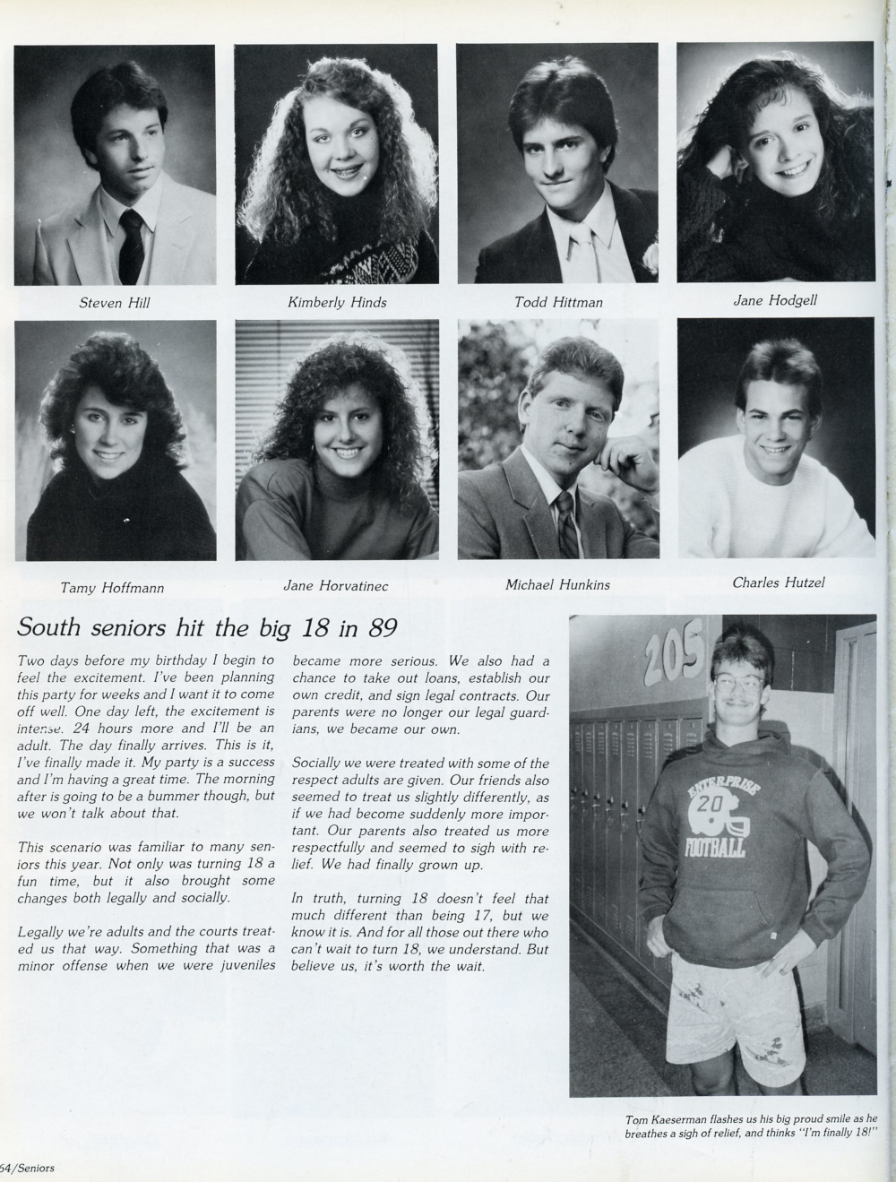 1989 Sheboygan South High School Yearbook Page 64: Steven Hill, Kimberly Hinds, Todd Hittman, Jane Hodgell, Tamy Hoffmann, Jane Horvatinec, Michael Hunkins, Charles Hutzel.