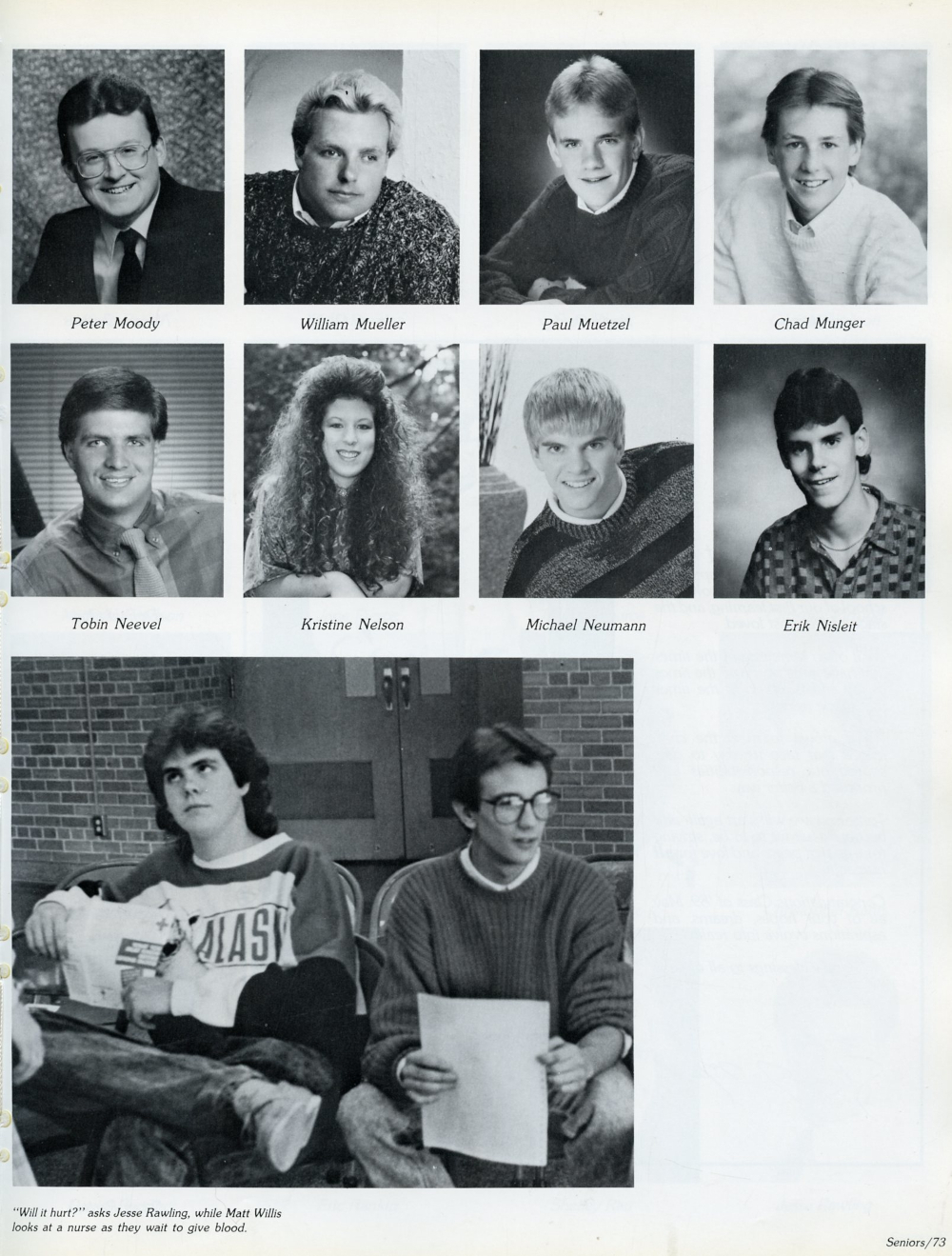 1989 Sheboygan South High School Yearbook Page 73: Peter Moody, William Mueller, Paul Muetzel, Chad Munger, Tobin Neevel, Kristine Nelson, Michael Neumann, Erik Nisleit.