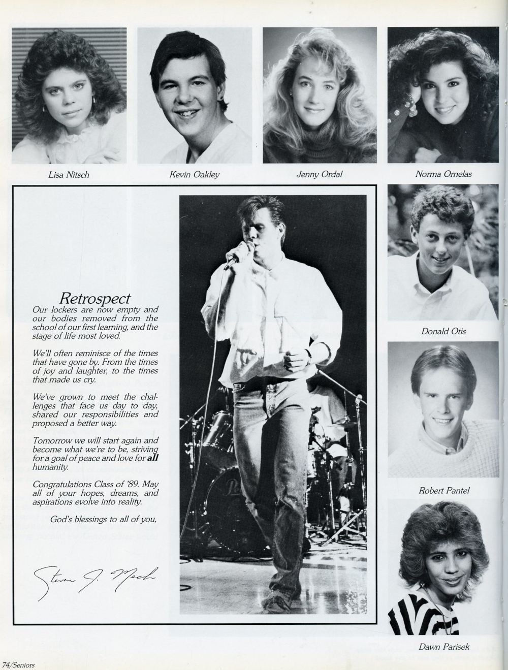 1989 Sheboygan South High School Yearbook Page 74: Lisa Nitsch, Kevin Oakley, Jenny Ordal, Norma Omelas, Donald Otis, Robert Pantel, Dawn Parisek.