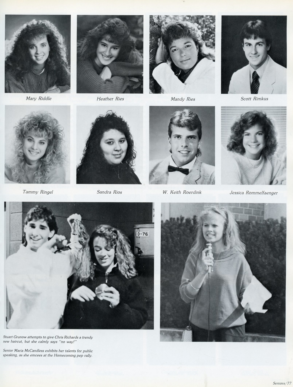 1989 Sheboygan South High School Yearbook Page 77: Mary Riddle, Heather Ries, Mandy Ries, Scott Rimkus, Tammy Ringel, Sandra Rios, W. Keith Roerdink, Jessica Rommelfaenger.