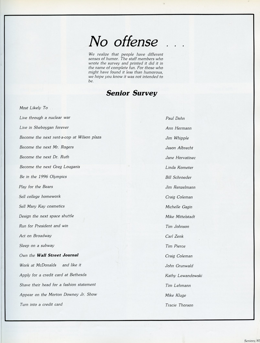1989 Sheboygan South High School Yearbook Page 85: Senior Survey.