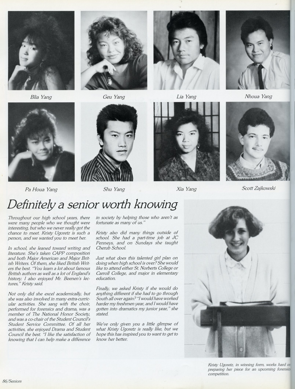 1989 Sheboygan South High School Yearbook Page 86: Blia Yang, Geu Yang, Lia Yang, Nhoua Yang, Pa Houa Yang, Shu Yang, Xia Yang, Scott Zajkowski.