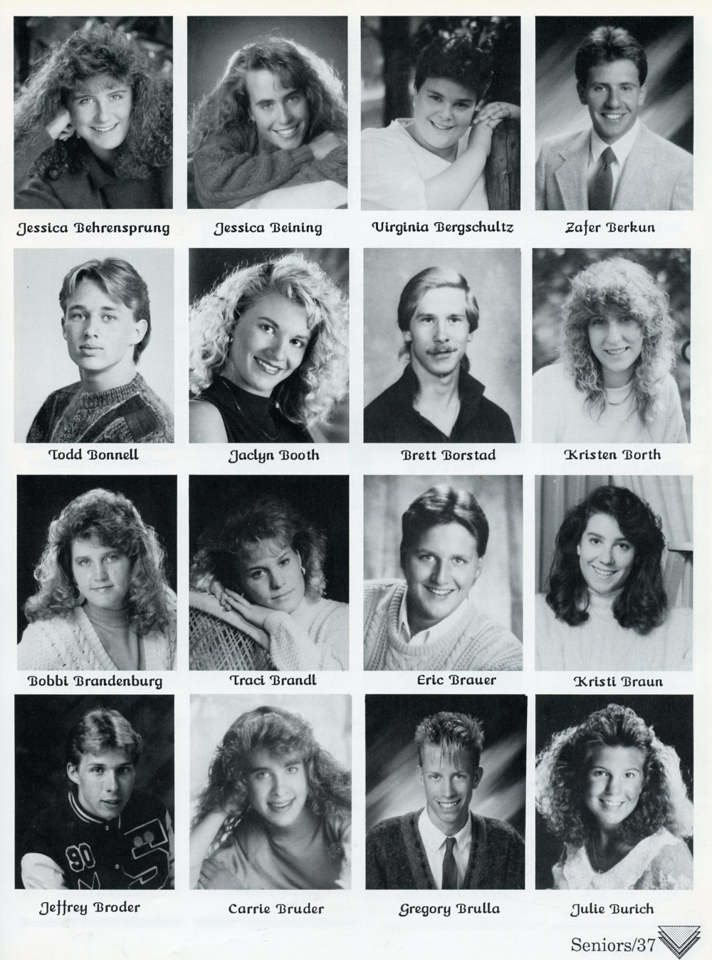 1990 Sheboygan South High School Yearbook Page 37: Jessica Behrensprung, Jessica Beining, Virginia Bergschultz, Zafer Berkun, Todd Bonnell, Jaclyn Booth, Brett Borstad, Kristen Borth, Bobbi Brandenburg, Traci Brandl, Eric Brauer, Kristi Braun, Jeffrey Broder, Carrie Bruder, Gregory Brulla, Julie Burich.