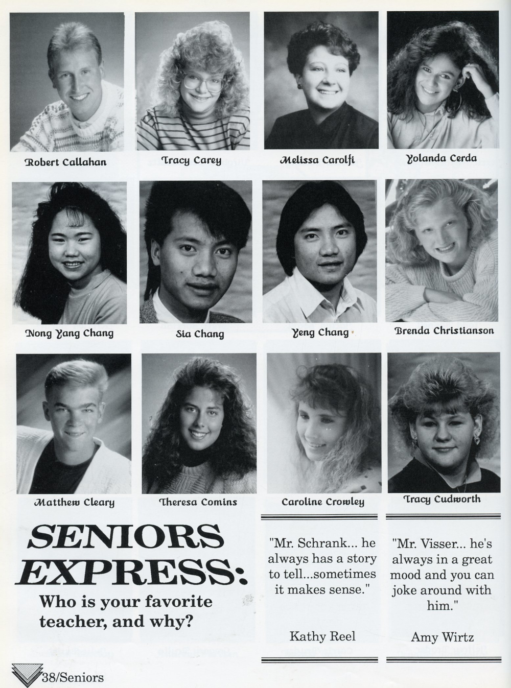 1990 Sheboygan South High School Yearbook Page 38: Robert Callahan, Tracy Carey, Melissa Carolfi, Yolanda Cerda, Nong Yang Chang, Sia Chang, Yeng Chang, Brenda Christianson, Matthew Cleary, Theresa Comins, Caroline Crowley, Tracy Cudworth.