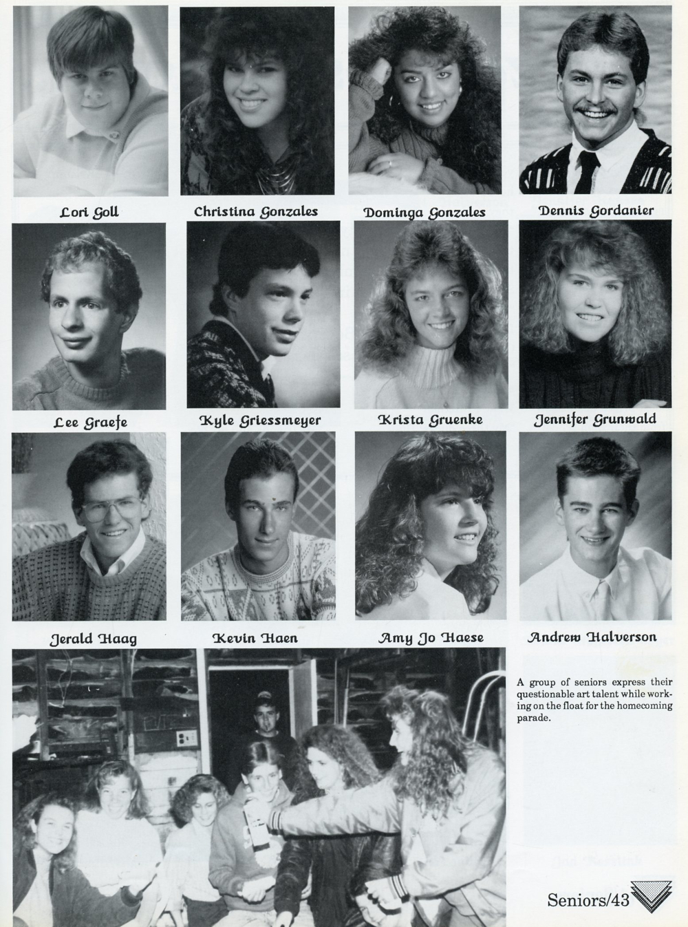 1990 Sheboygan South High School Yearbook Page 43: Lori Goll, Christina Gonzales, Dominga Gonzales, Dennis Gordanier, Lee Graefe, Kyle Griessmeyer, Krista Gruenke, Jennifer Grunwald, Jerald Haag, Kevin Haen, Amy Jo Haese, Andrew Halverson.