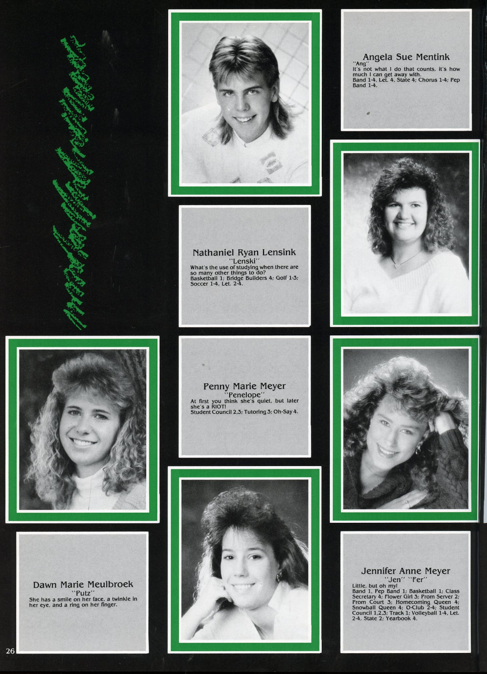 1992 Oostburg High School Page 26: Nathaniel Ryan Lensink, Angela Sue Mentink, Dawn Marie Muelbroek, Jennifer Anne Meyer, Penny Marie Meyer.
