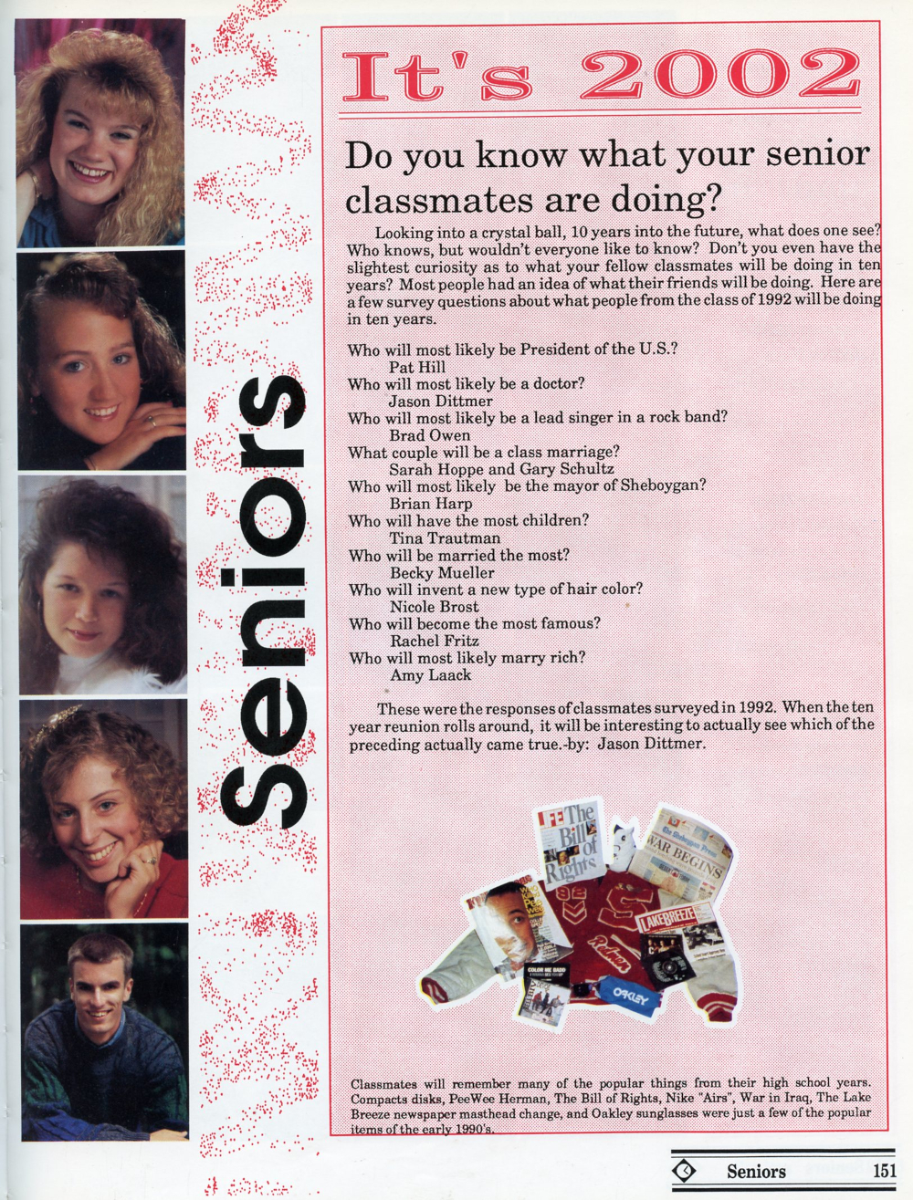 1992 Sheboygan South High School Yearbook Page 151: Jennifer Ehlert, Dana Fischer, Crystal Gabrich, Annette Gordon, Matthew Groth.