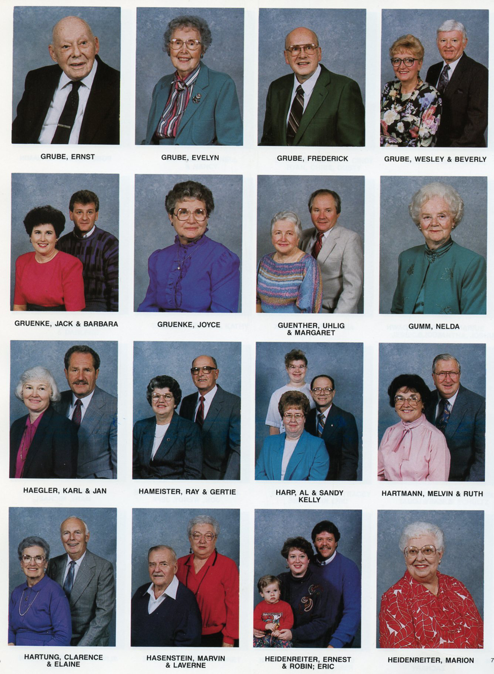1992 Zion United Church of Christ Directory, Page 12: Ernst Grube, Evelyn Grube, Frederick Grube, Wesley and Beverly Grube, Jack and Barbara Gruenke, Joyce Gruenke, Uhlig and Margaret Guenther, Nelda Gumm, Karl and Jan Haegler, Ray and Gertie Hameister, Al and Sandy and Kelly Harp, Melvin and Ruth Hartmann, Clarence and Elaine Hartung, Marvin and Laverne Hasenstein, Ernest and Robin and Eric Heidenreiter, Marion Heidenreiter.