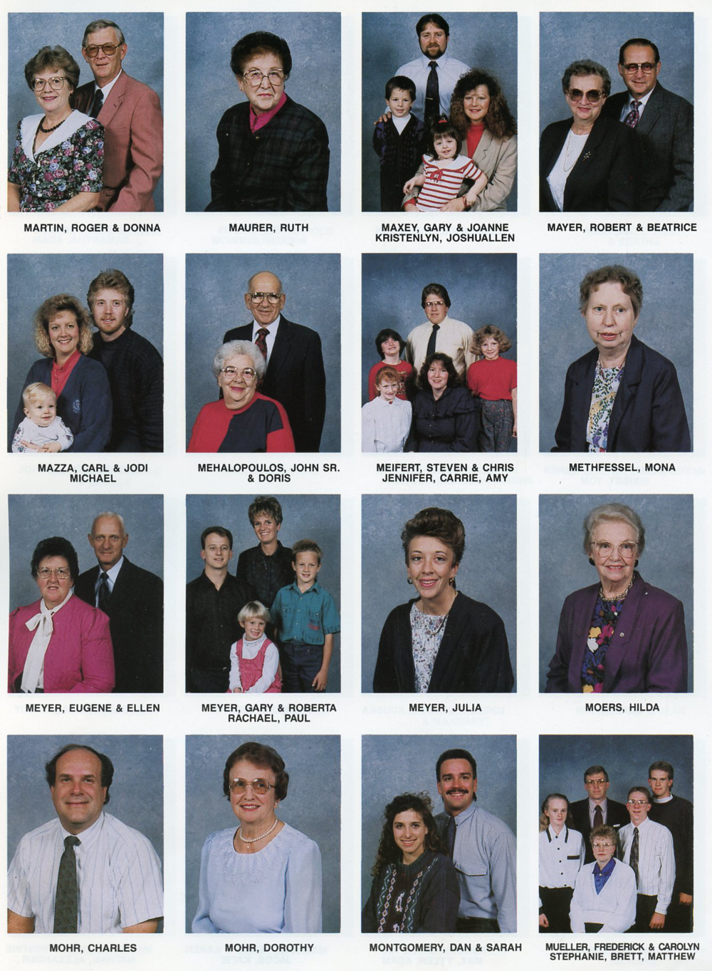 1992 Zion United Church of Christ Directory, Page 16: Roger and Donna Martin, Ruth Maurer, Gary and Joanne and Kristenlyn and Joshuallan Maxey, Robert and Beatrice Mayer, Carol and Jodi and Michael Mazza, John Sr. and Doris Mehalopoulos, Steven and Chris and Jennifer and Carrie and Amy Meifert, Mona Methfessel, Eugene and Ellen Meyer, Gary and Roberta and Rachael and Paul Meyer, Julia Meyer, Hilda Moers, Charles Mohr, Dorothy Mohr, Dan and Sarah Montgomery, Frederick and Carolyn and Stephanie and Brett and Matthew Mueller.
