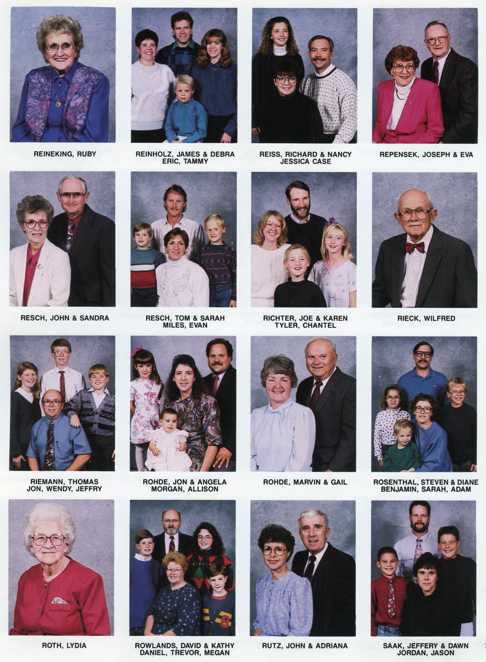 1992 Zion United Church of Christ Directory, Page 18: Ruby Reineking, James and Debra and Eric and Tammy Reinholz, Richard and Nancy Reiss, Jessica Case, Joseph and Eva Repensek, John and Sandra Resch, Tom and Sarah and Miles and Evan Resch, Joe and Karen and Tyler and Chantel Richter, Wilfred Rieck, Thomas and Jon and Wendy and Jeffry Riemann, Jon and Angela and Morgan and Allison Rohde, Marvin and Gail Rohde, Steven and Diane and Benjamin and Sarah and Adam Rosenthal, Lydia Roth, David and Kathy and Daniel and Trevor and Megan Rowlands, John and Adriana Rutz, Jeffrey and Dawn and Jordan and Jason Saak.
