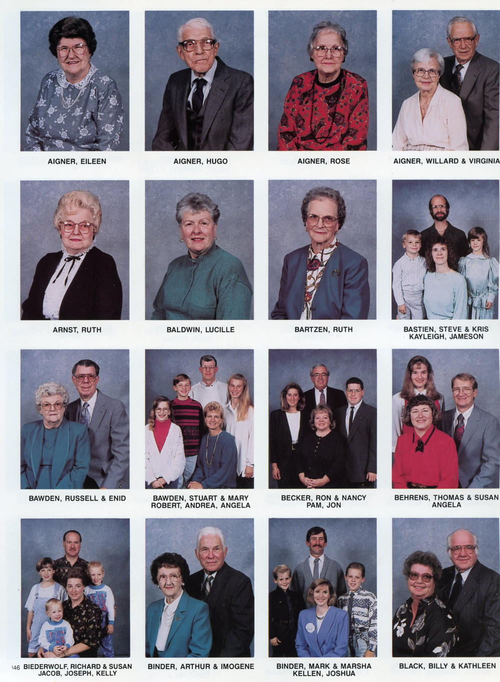 1992 Zion United Church of Christ Directory, Page 7: Eileen Aigner, Hugo Aigner, Rose Aigner, Willand and Virginia Aigner, Ruth Arnst, Lucille Baldwin, Ruth Bartzen, Steve and Kris and Kayleigh and Jameson Bastien, Russell and Enid Bawden, Stuart and Mary and Robet and Andrea And Angela Bawden, Ron and Nancy and Pam and Jon Becker, Thomas and Susan and Angela Behrens, Richard and Susan and Jacob and Joseph and Kelly Biederwolf, Arthur and Imogene Binder, Mark and Marsha and Kellen and Joshua Binder, Billy and Kathleen Black.