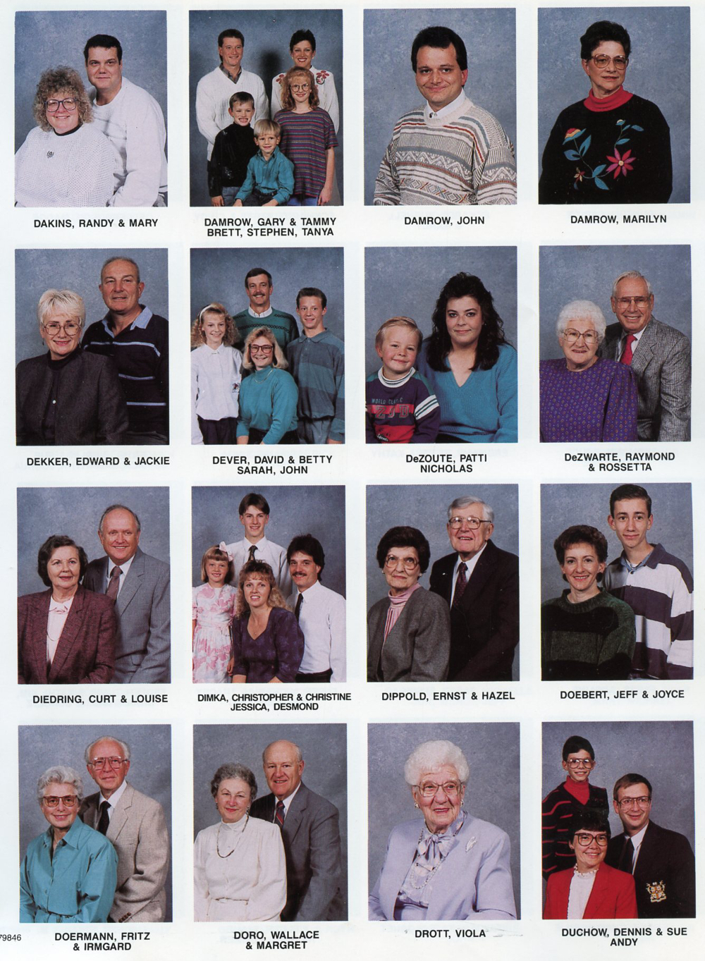 1992 Zion United Church of Christ Directory, Page 9: Randy and Mary Dakins, Gary and Tammy and Brett and Stephen and Tanya Damrow, John Damrow, Marilyn Damrow, Edward and Jackie Dekker, David and Betty and Sarah and John Dever, Patti and Nicholas DeZoute, Raymond and Rosetta DeZwarte, Curt and Louise Diedring, Christopher and Christine and Jessica and Desmond Dimka, Ernst and Hazel Dippold, Jeff and Joyce Doebert, Fritz and Irmgard Doermann, Wallace and Margaret Doro, Viola Drott, Dennis and Sue and Andy Duchow.