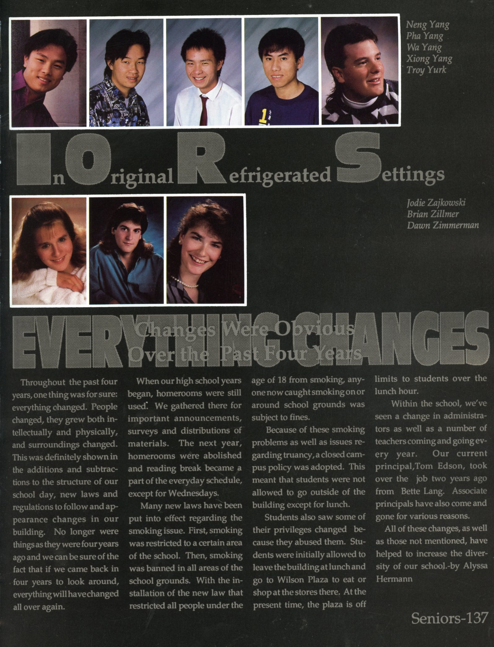 1993 Sheboygan South High School Yearbook Page 137: Neng Yang, Pha Yang, WA Yang, Xiong Yang, Troy Yurk, Jodie Zajkowski, Brian Zillmer, Dawn Zimmerman.