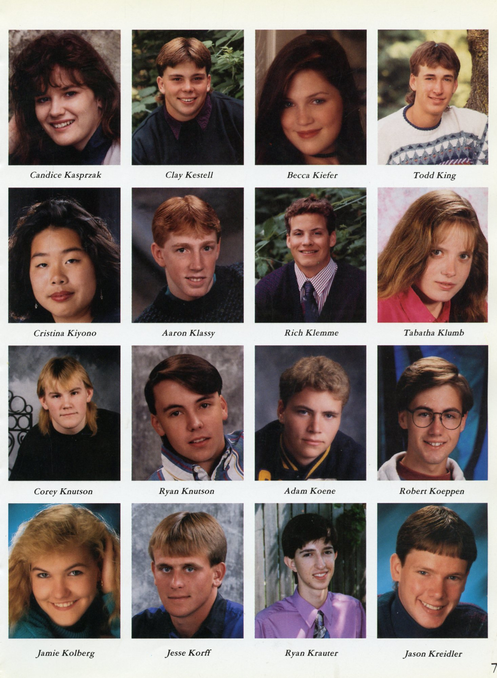 1994 Sheboygan Falls High School Yearbook Page 7: Candice Kasprzak, Becca Kiefer, Todd King, Cristina Kiyono, Aaron Klassy, Rich Klemme, Tabatha Klumb, Corey Knutson, Ryan Knutson, Adam Koene, Robert Koeppen, Jamie Kolberg, Jesse Korff, Ryan Krauter, Jason Kreidler.