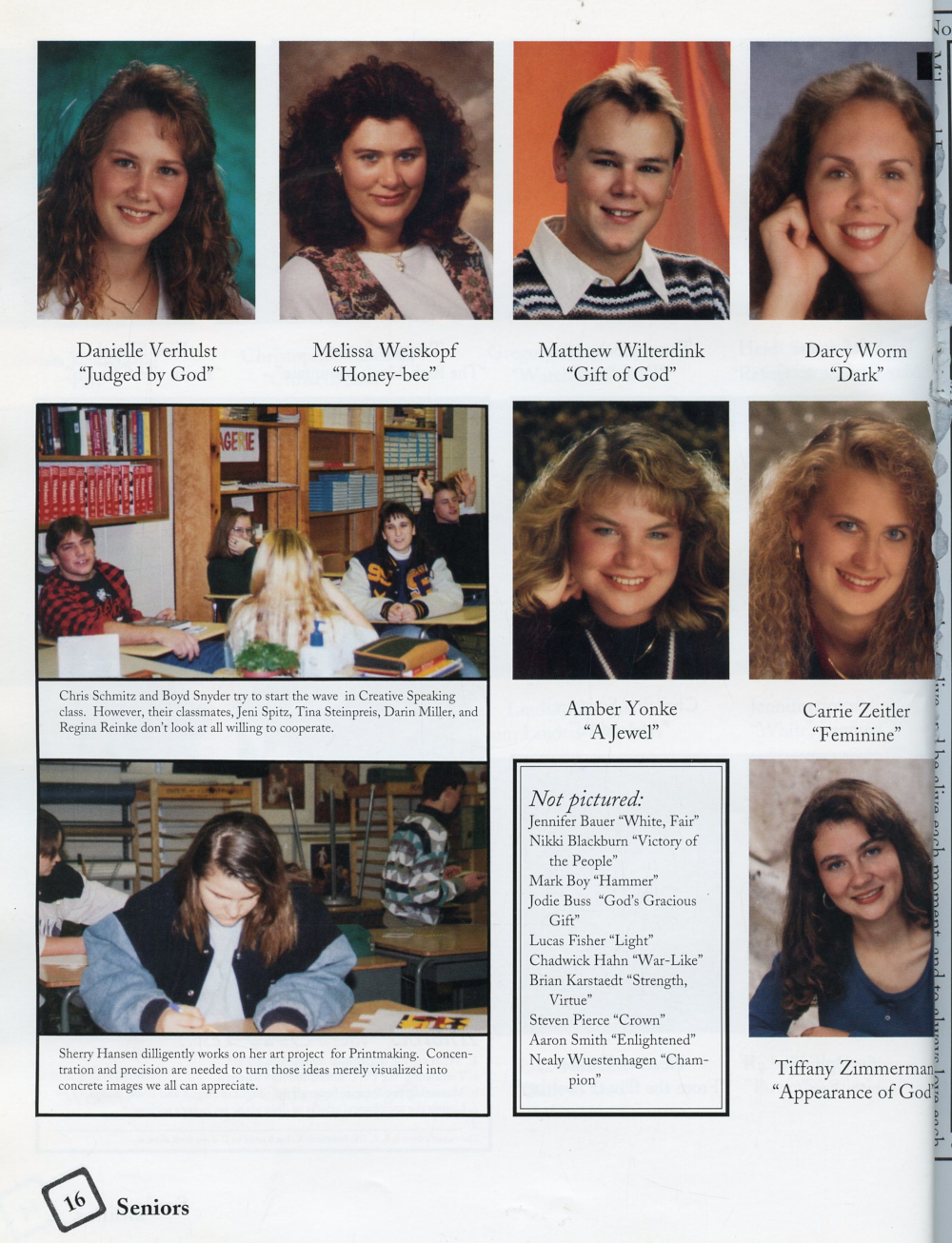 1995 Sheboygan Falls High School Yearbook Page 16: Danielle Verhulst, Melissa Weiskopf, Matthew Wilterdink, Darcy Worm, Amber Yonke, Carrie Zeitler, Tiffany Zimmerman, Jennifer Bauer, Nikki Blackburn, Mark Boy, Jodie Buss, Lucas Fisher, Chadwick Hahn, Brian Karstaedt, Steven Pierce, Aaron Smith, Nealy Wuesterhagen.