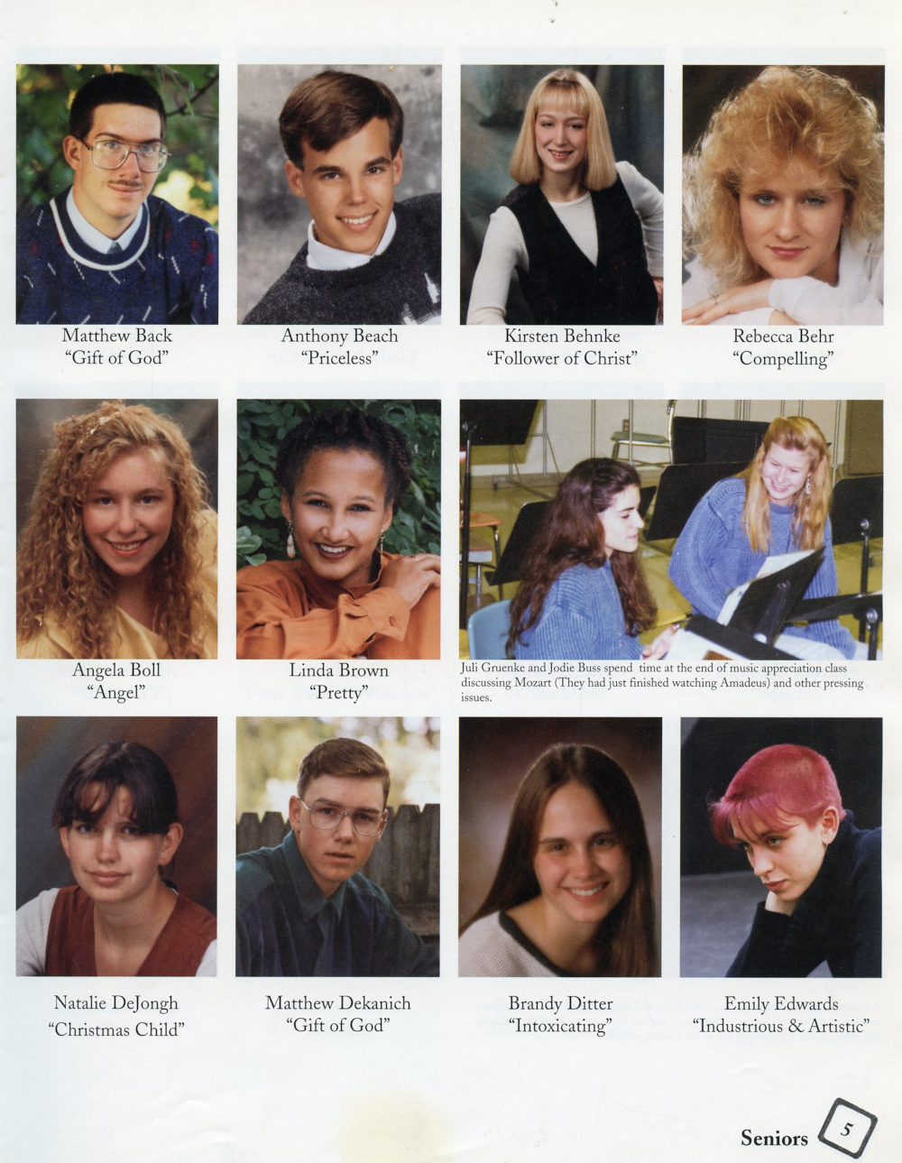 1995 Sheboygan Falls High School Yearbook Page 5: Matthew Back, Anthony Beach, Kirsten Behnke, Rebecca Behr, Angela Boll, Linda Brown, Natalie DeJongh, Matthew Dekanich, Brandy Ditter, Emily Edwards.