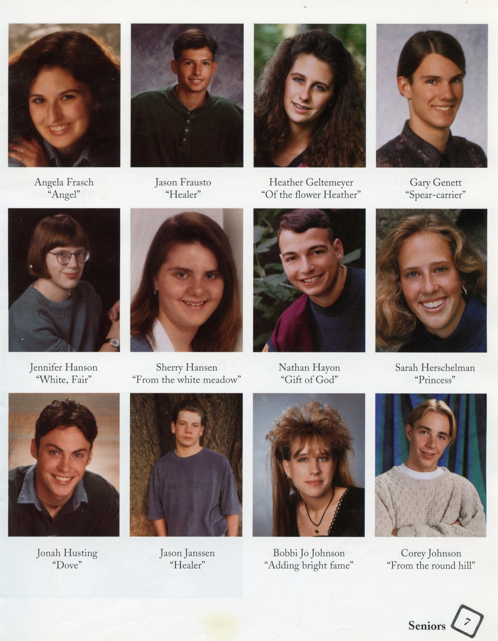 1995 Sheboygan Falls High School Yearbook Page 7: Angela Frasch, Jason Frausto, Heather Geltemeyer, Gary Genett, Jennifer Hanson, Sherry Hansen, Nathan Hayon, Sarah Herschelman, Jonah Husting, Jason Janssen, Bobbi Jo Johnson, Corey Johnson.