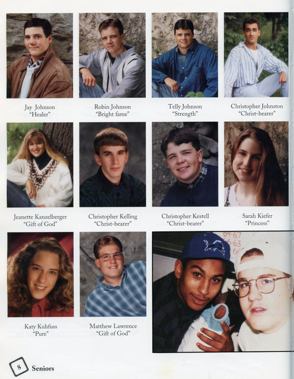 1995 Sheboygan Falls High School Yearbook Page 8: Jay Johnson, Robin Johnson, Telly Johnson, Christopher Johnston, Jeanette Kanzelberger, Christopher Kelling, Christopher Kestell, Sarah Kiefer, Katy Kuhfuss, Matthew Lawrence.