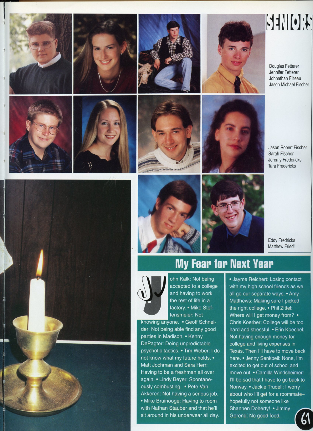 1995 Sheboygan North High School Yearbook Page 61: Douglas Fetterer, Jennifer Fetterer, Johnathan Filteau, Jason Michael Fischer, Jason Robert Fischer, Sarah Fischer, Jeremy Fredericks, Tara Fredericks, Eddy Fredricks, Matthew Friedl.