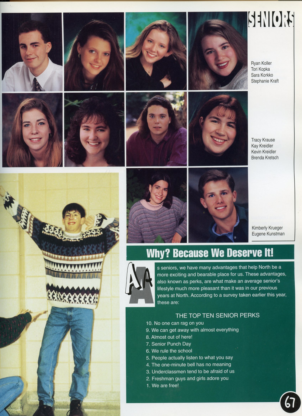 1995 Sheboygan North High School Yearbook Page 67: Ryan Koller, Tori Kopka, Sara Korkko, Stephanie Kraft, Tracy Krause, Kay Kreidler, Kevin Kreidler, Brenda Kretsch, Kimberly Krueger, Eugene Kunstman.