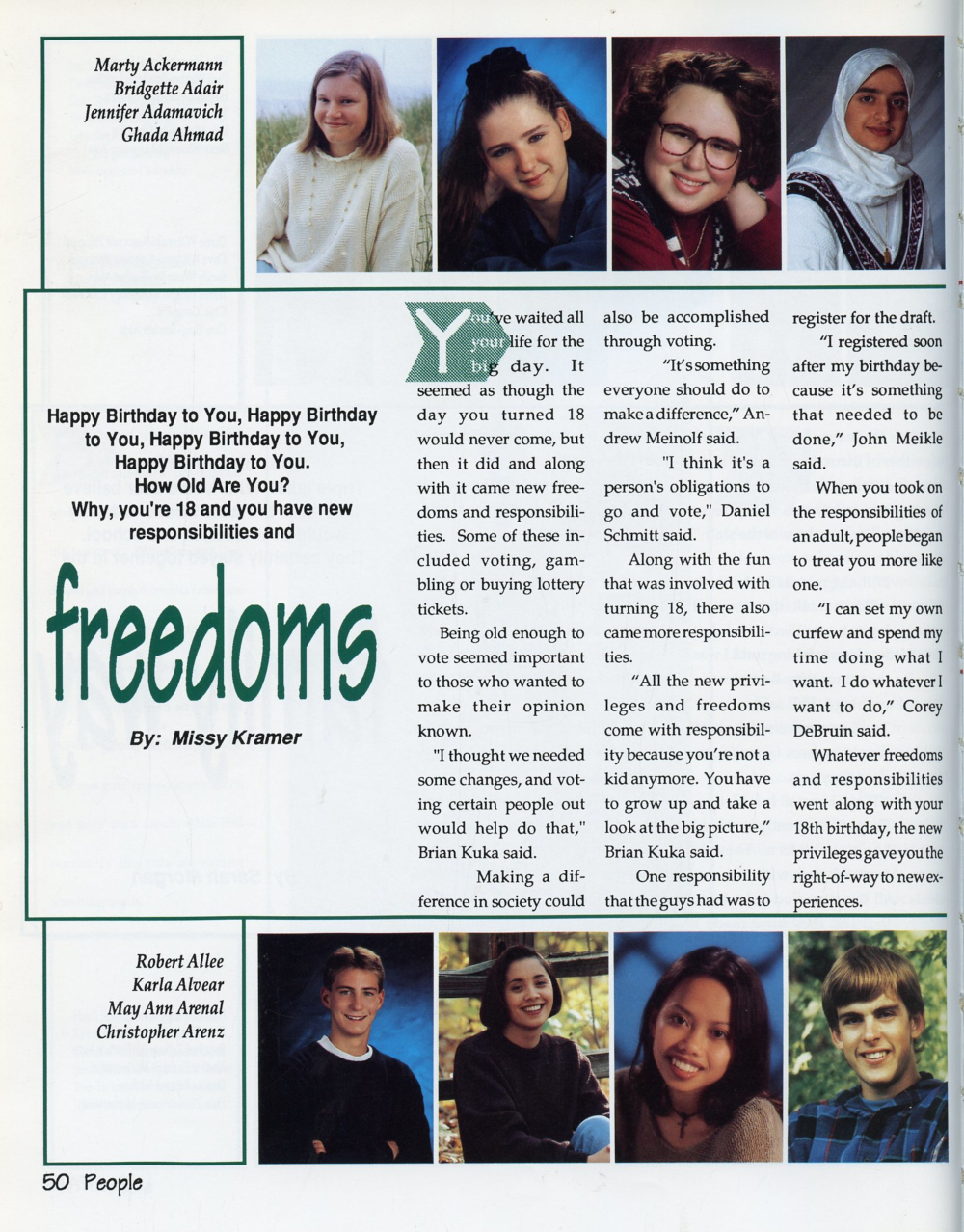 1995 Sheboygan South High School Yearbook Page 50: Marty Ackermann, Bridgette Adair, Jennifer Adamavich, Ghada Ahmad, Robert Allee, Karla Alvear, May Ann Arenal, Christopher Arenz.