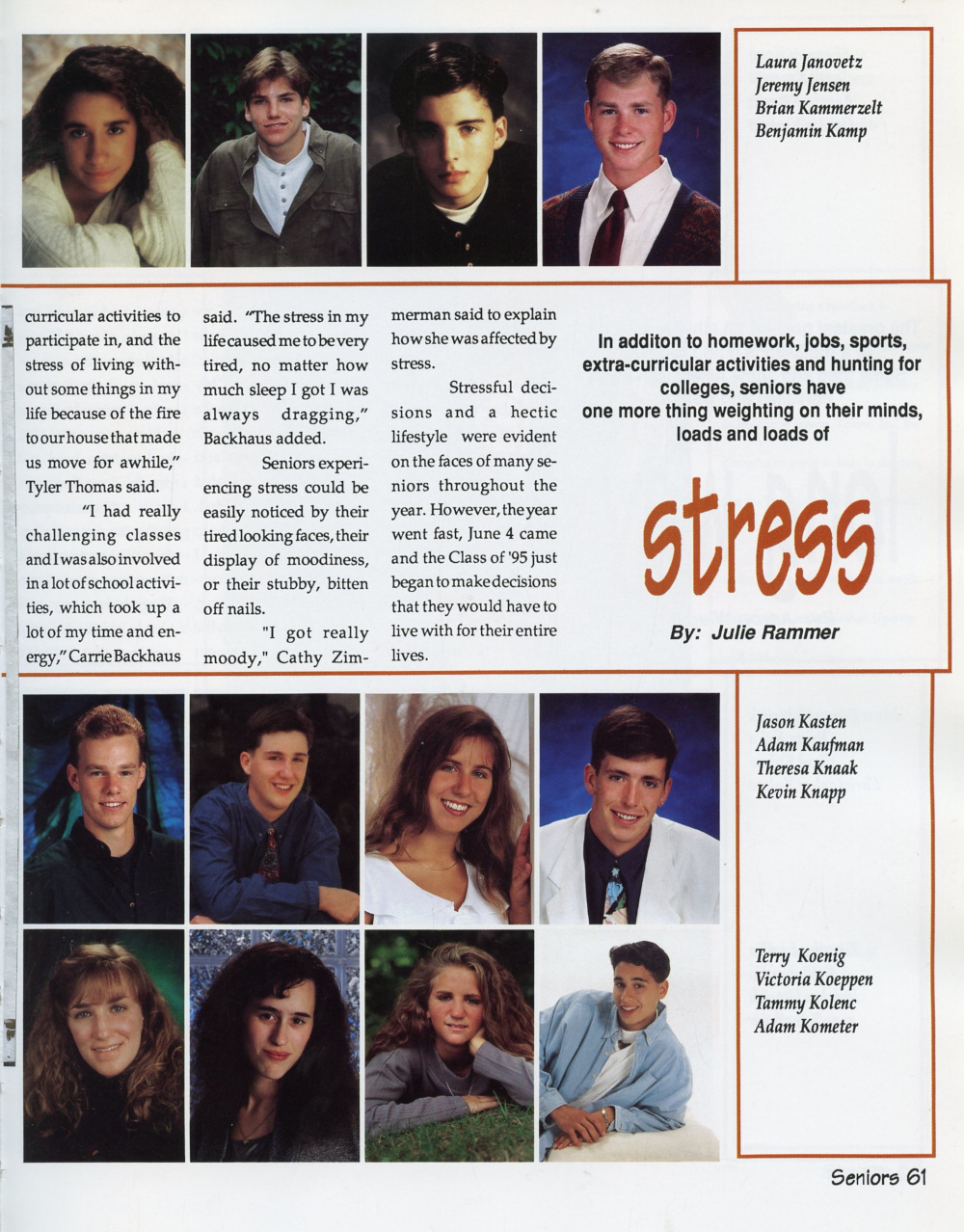 1995 Sheboygan South High School Yearbook Page 61: Laura Janovetz, Jeremy Jensen, Brian Kammerzelt, Benjamin Kamp, Jason Kasten, Adam Kaufman, Theresa Knaak, Kevin Knapp, Terry Koenig, Victoria Koeppen, Tammy Kolenc, Adam Kometer.