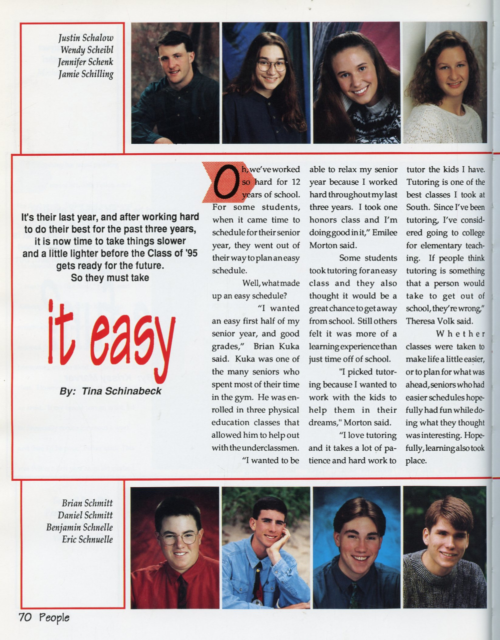 1995 Sheboygan South High School Yearbook Page 70: Justin Schalow, Wendy Scheibl, Jennifer Schenk, Jamie Schilling, Brian Schmitt, Daniel Schmitt, Benjamin Schnelle, Eric Schnuelle.