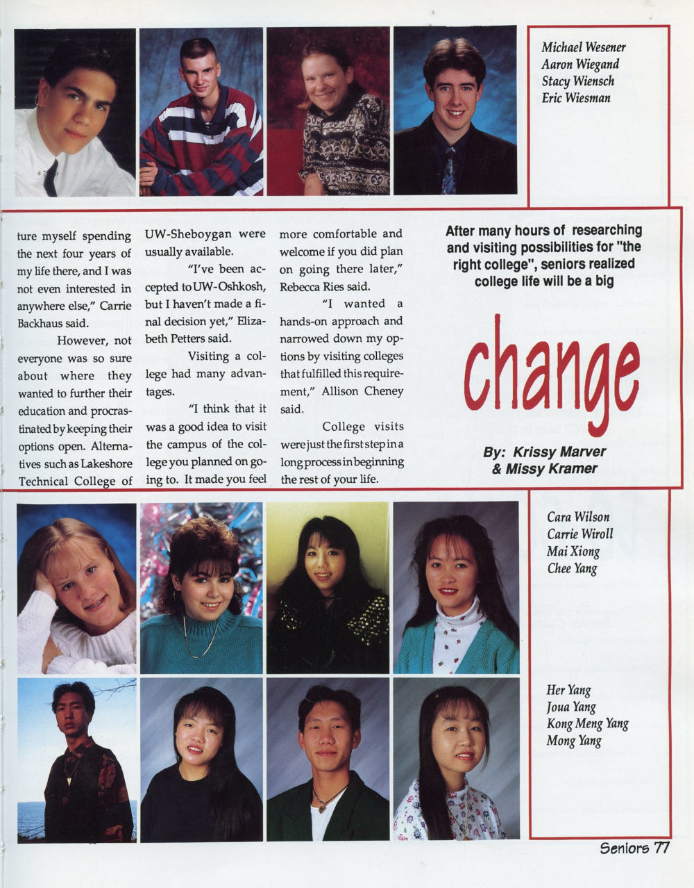 1995 Sheboygan South High School Yearbook Page 77: Michael Wesener, Aaron Wiegand, Stacy Wiensch, Eric Wiesman, Cara Wilson, Carrie Wiroll, Mai Xiong, Chee Yang, Her Yang, Joua Yang, Kong Meng Yang, Mong Yang.