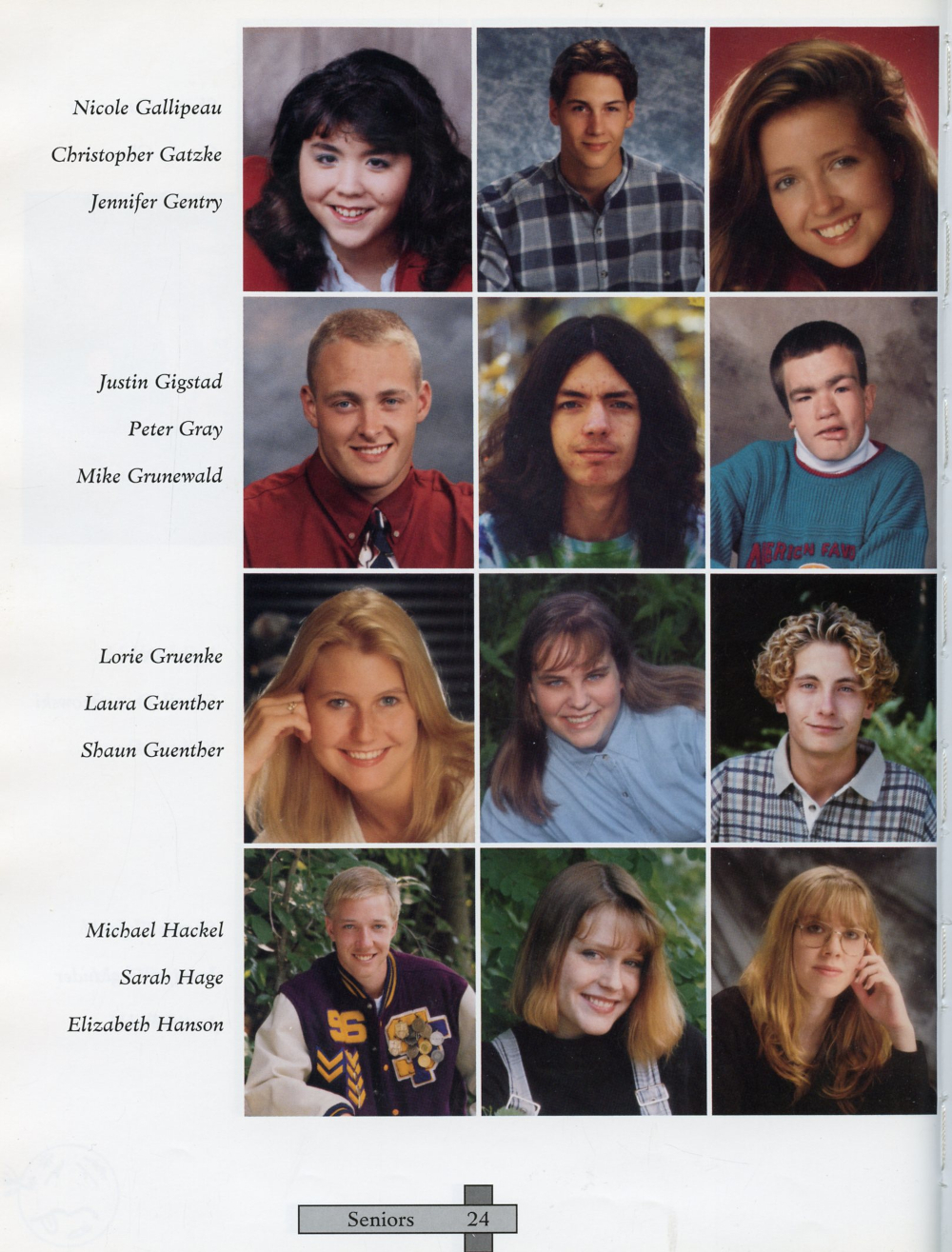 1996 Sheboygan Falls High School Yearbook Page 24: Nicole Gallipeau, Christopher Gatzke, Jennifer Gentry, Justin Gigstad, Peter Gray, Mike Grunewald, Lorie Gruenke, Laura Guenther, Shaun Guenther, Michael Hackel, Sarah Hage, Elizabeth Hanson.