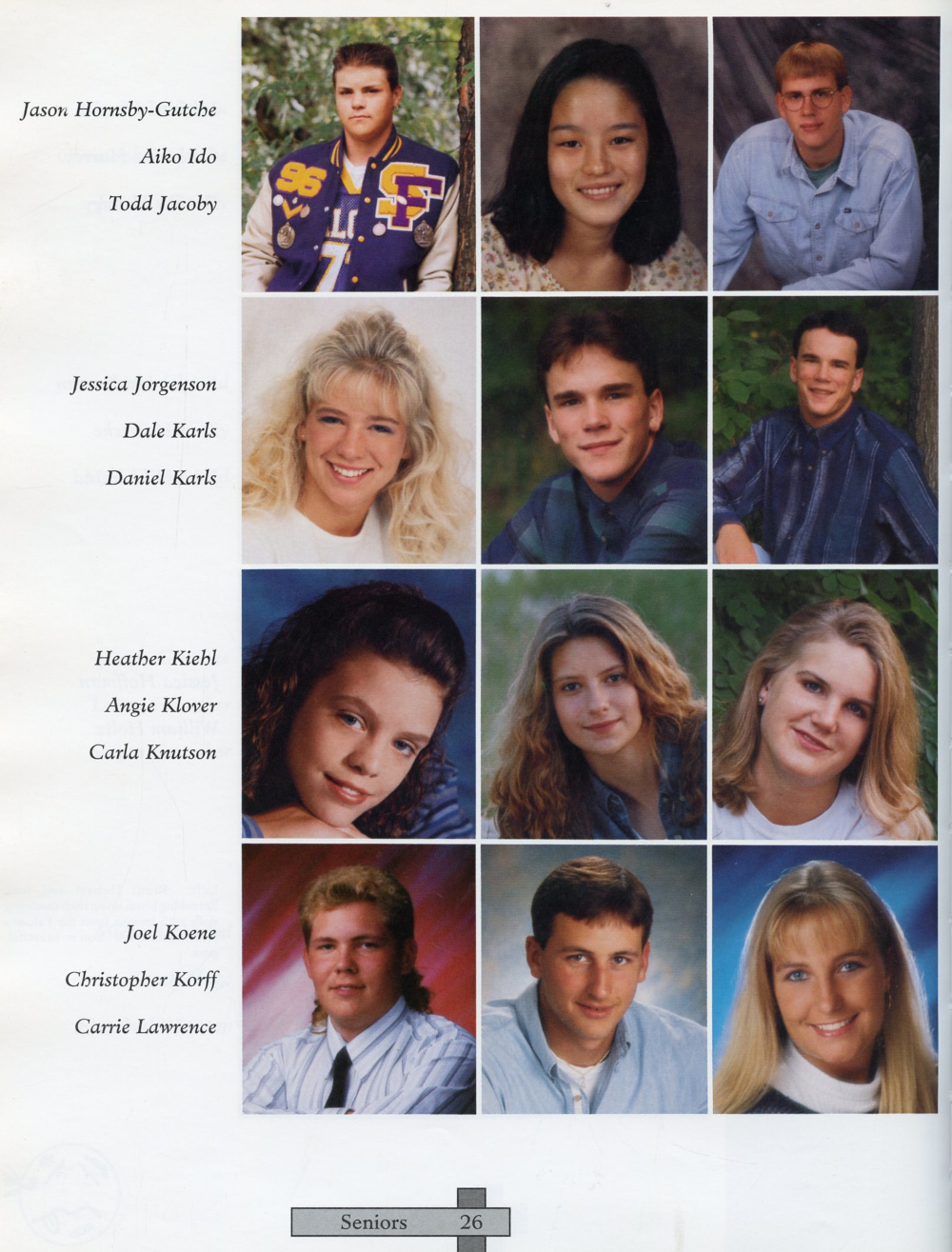 1996 Sheboygan Falls High School Yearbook Page 26: Jason Hornsby-Gutche, Aiko Ido, Todd Jacoby, Jessica Jorgenson, Dale Karls, DAniel Karls, Heather Kiehl, Angie Klover, Carla Knutson, Joel Koene, Christopher Korff, Carrie Lawrence.