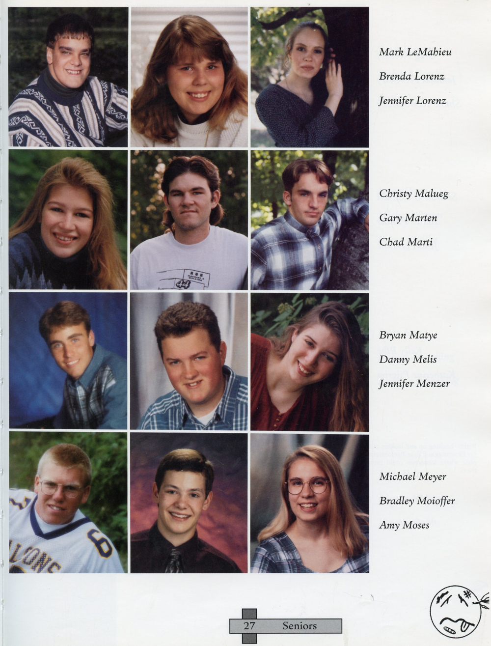 1996 Sheboygan Falls High School Yearbook Page 27: Mark LeMahieu, Brenda Lorenz, Jennifer Lorenz, Christy Malueg, Gary Marten, Chad Marti, Bryan Matye, Danny Melis, Jennifer Menzer, Michael Meyer, Bradley Moioffer, Amy Moses.