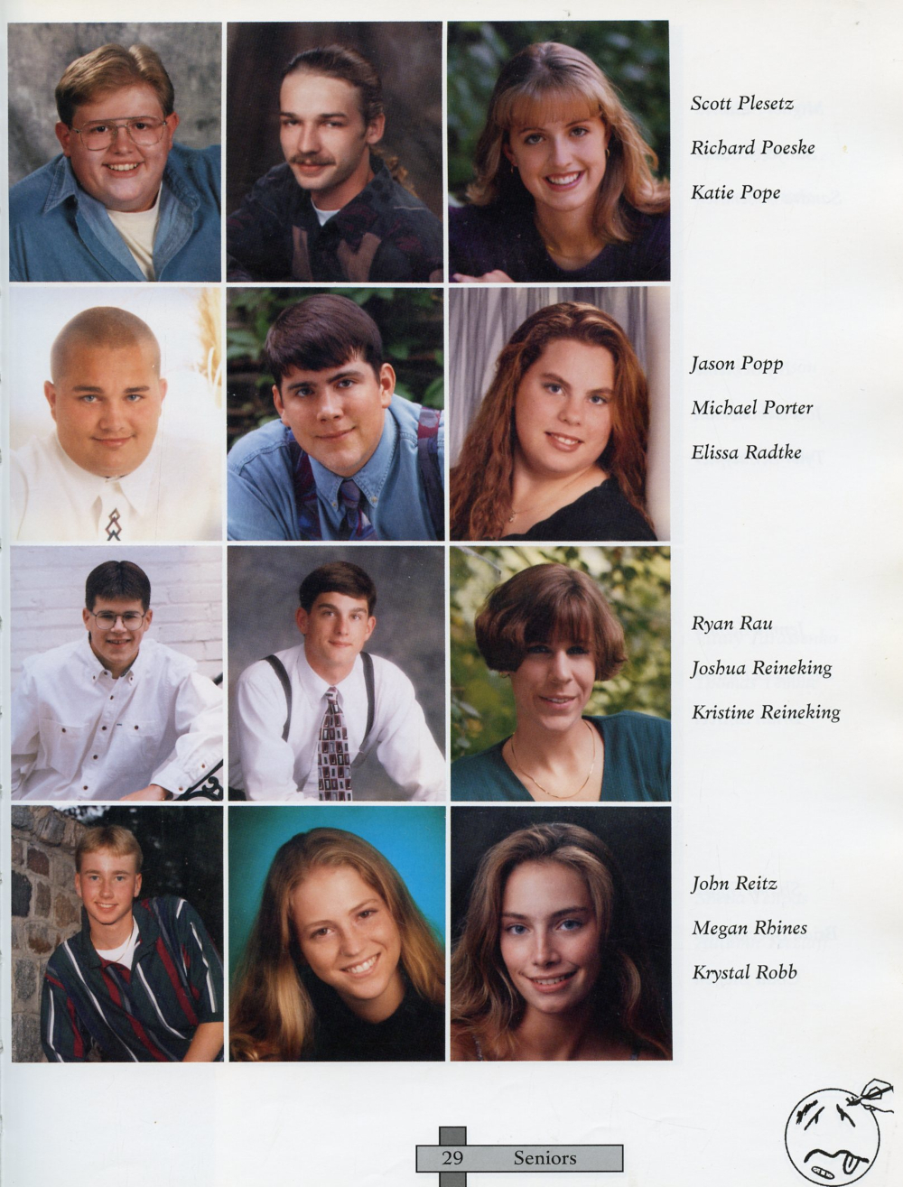 1996 Sheboygan Falls High School Yearbook Page 29: Scott Plesetz, Richard Poeske, Katie Pope, Jason Popp, MIchael Porter, Elissa Radtke, Ryan Rau, Joshua Reineking, Kristine Reineking, John Reitz, Megan Rhines, Krystal Robb.