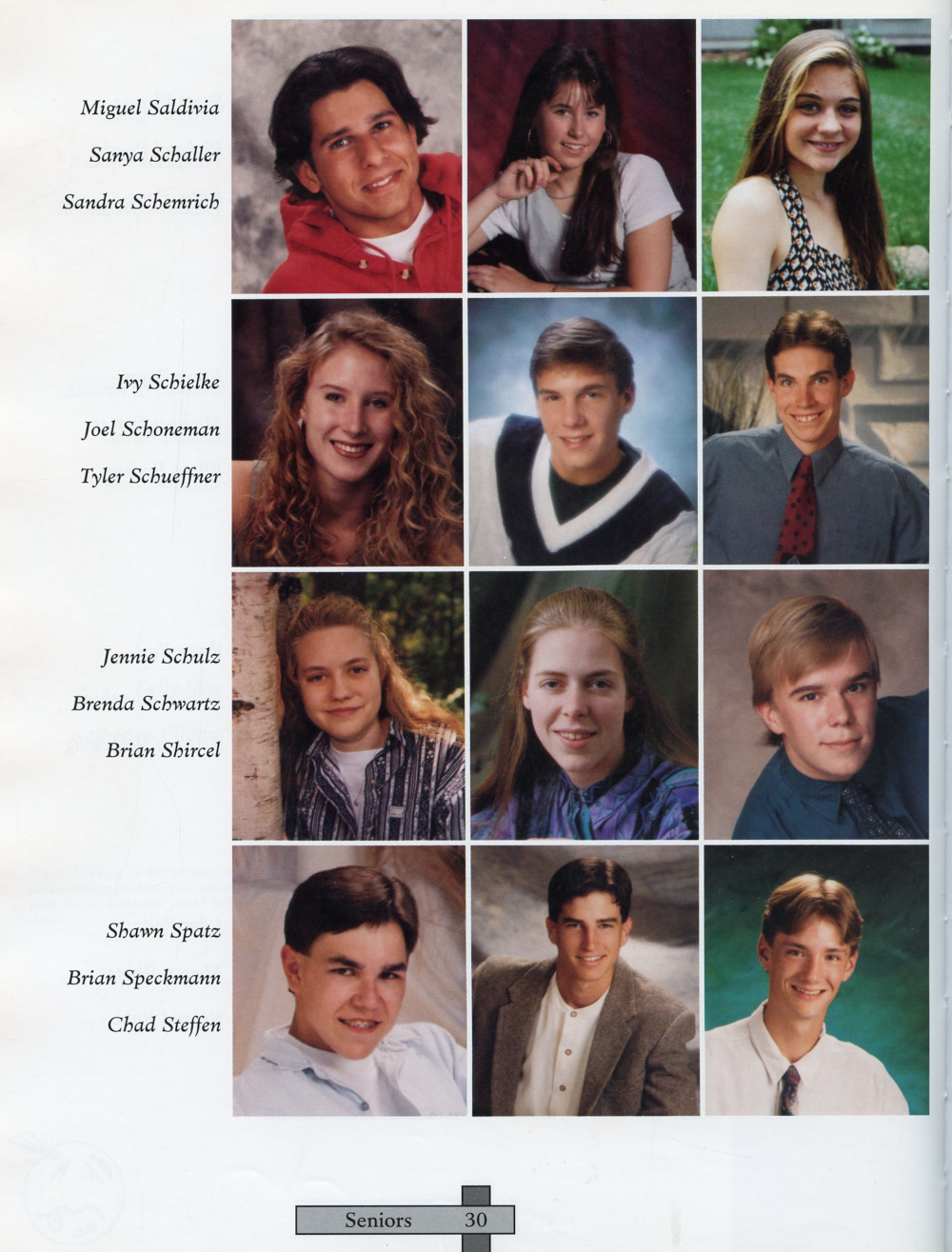1996 Sheboygan Falls High School Yearbook Page 30: Miguel Saldivia, Sanya Schaller, Sandra Schemrich, Ivy Schielke, Joel Schoneman, Tyler Schueffner, Jennie Schulz, Brenda Schwartz, Brian Shircel, Shawn Spatz, Brian Speckmann, Chad Steffen.