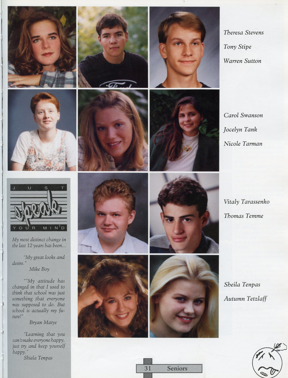 1996 Sheboygan Falls High School Yearbook Page 31: Theresa Stevens, Tony Stipe, Warren Sutton, Carol Swanson, Jocelyn Tank, Nicole Tarman, Vitaly Taarassenko, Thomas Temme, Sheila Tenpas, Autumn Tetzlaff.