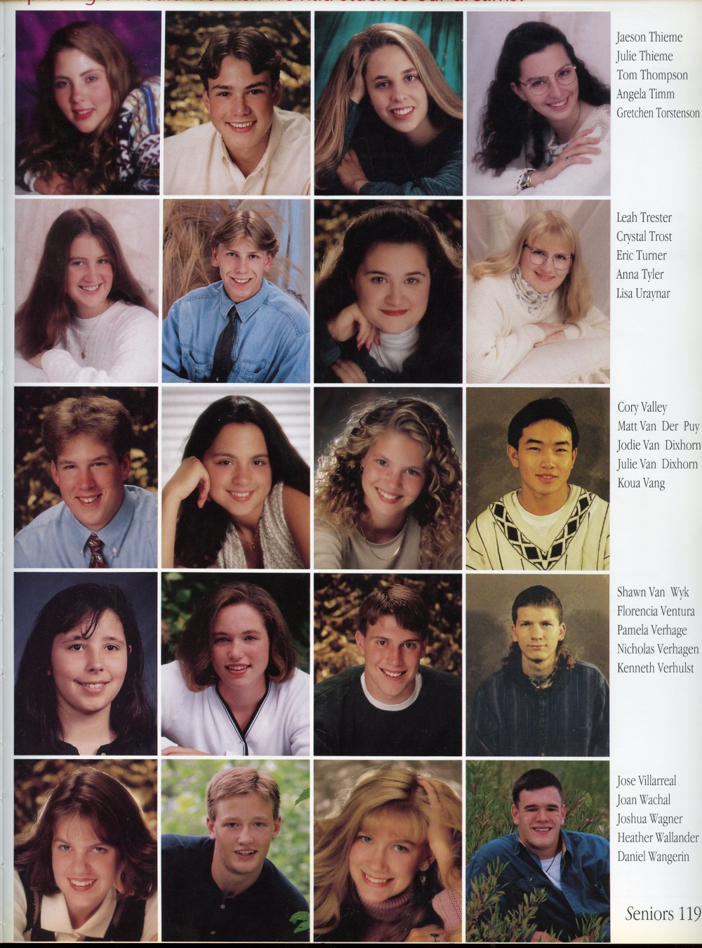 Jodie Van Dixhorn, Julie Van Dixhorn, Koua Vang, Florencia Ventura, Pamela Verhage, Nicholas Verhagen, Kenneth Verhulst, Joan Wachal, Joshua Wagner, Heather Wallander,