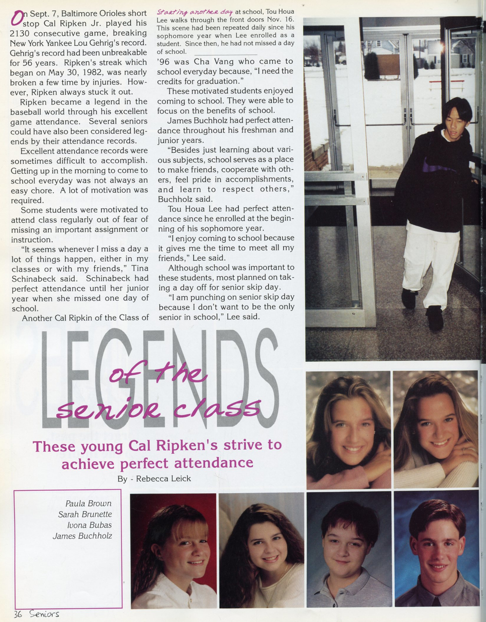 1996 Sheboygan South High School Yearbook Page 36: Andrea Dittmer, Danielle Dittmer, Paula Brown, Sarah Brunette, Ivona Bubas, James Buchholz.