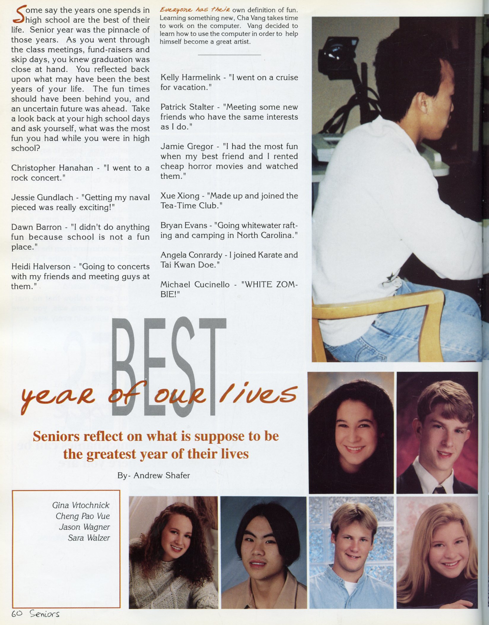 1996 Sheboygan South High School Yearbook Page 60: Nicole Welch, Derek Williamson, Gina Vrtochnick, Cheng Pao Vue, Jason Wagner, Sara Walzer.