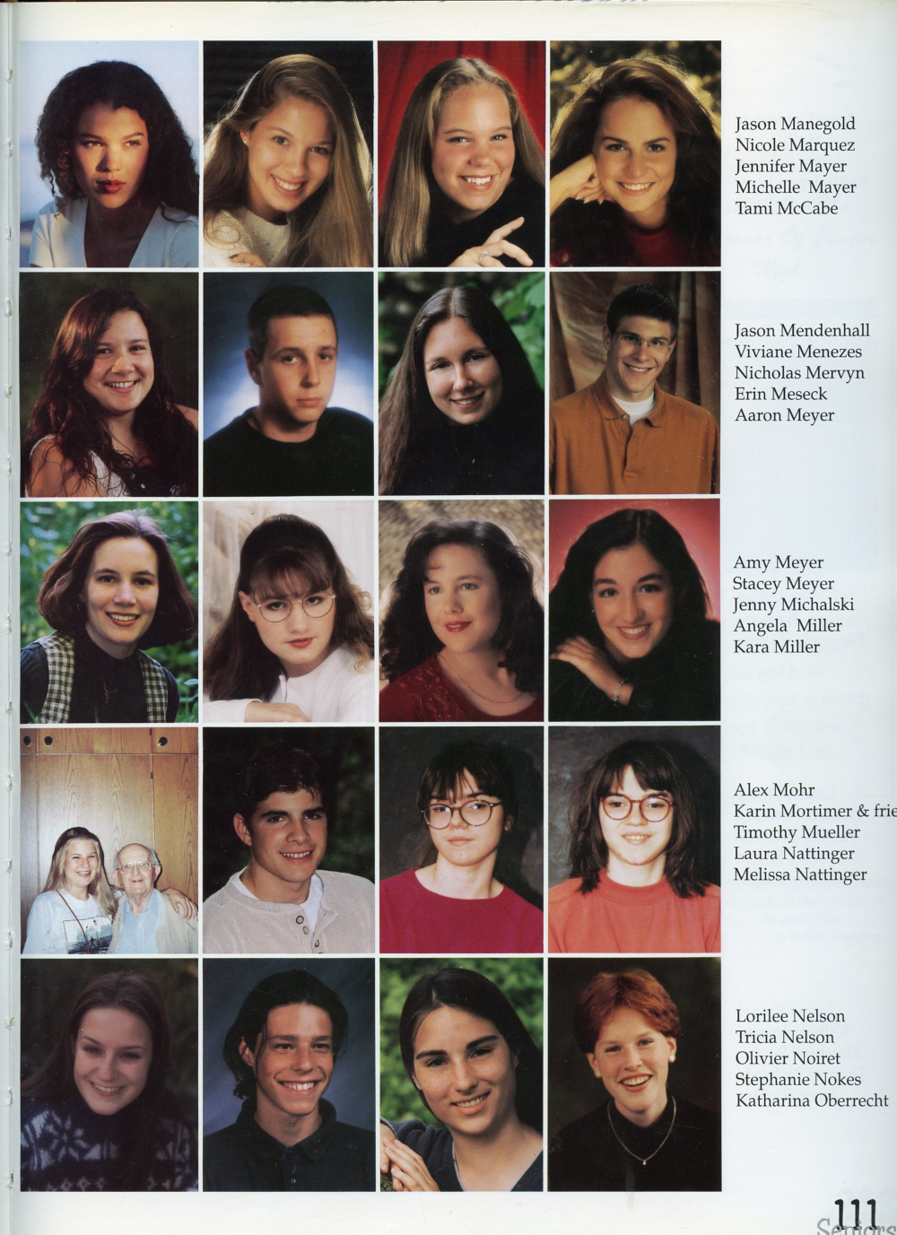1997 Sheboygan North High School Yearbook Page 111: Nicole Marquez, Jennifer Mayer, Michelle Mayer, Tami McCabe, Viviane Menezes, Nicholas Mervyn, Erin Meseck, Aaron Meyer, Stacey Meyer, Jenny Michalski, Angela Miller, Kara Miller, Karin Mortimer, Timothy Mueller, Laura Nattinger, Melissa Nattinger, Tricia Nelson, Olivier Noiret, Stephanie Nokes, Katharina Oberrecht.
