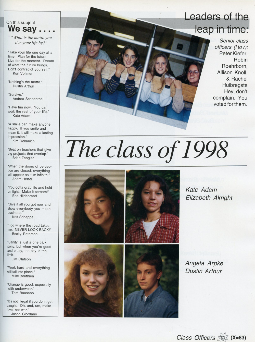 1998 Sheboygan Falls High School Yearbook Page 83: Kate Adam, Elizabeth Akright, Angela Arpke, Dustin Arthur.