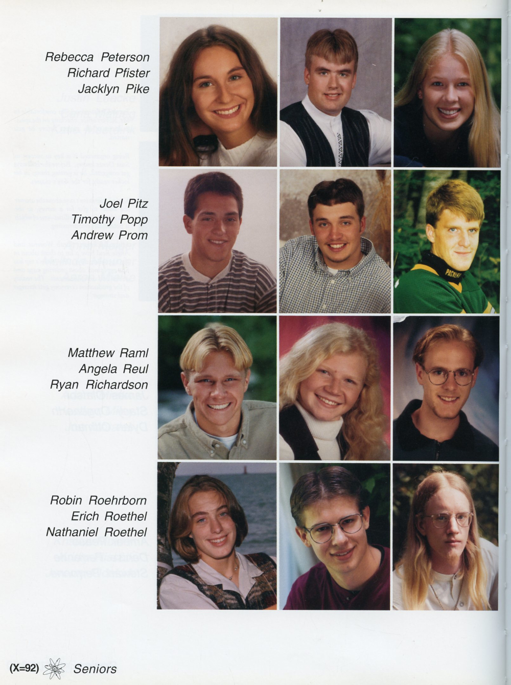 1998 Sheboygan Falls High School Yearbook Page 92: Rebecca Peterson, Richard Pfister, Jacklyn Pike, Joel Pitz, Timothy Popp, Andrew Prom, Matthew Raml, Angela Reul, Ryan Richardson, Robin Roehrborn, Erich Roethel, Nathaniel Roethel.