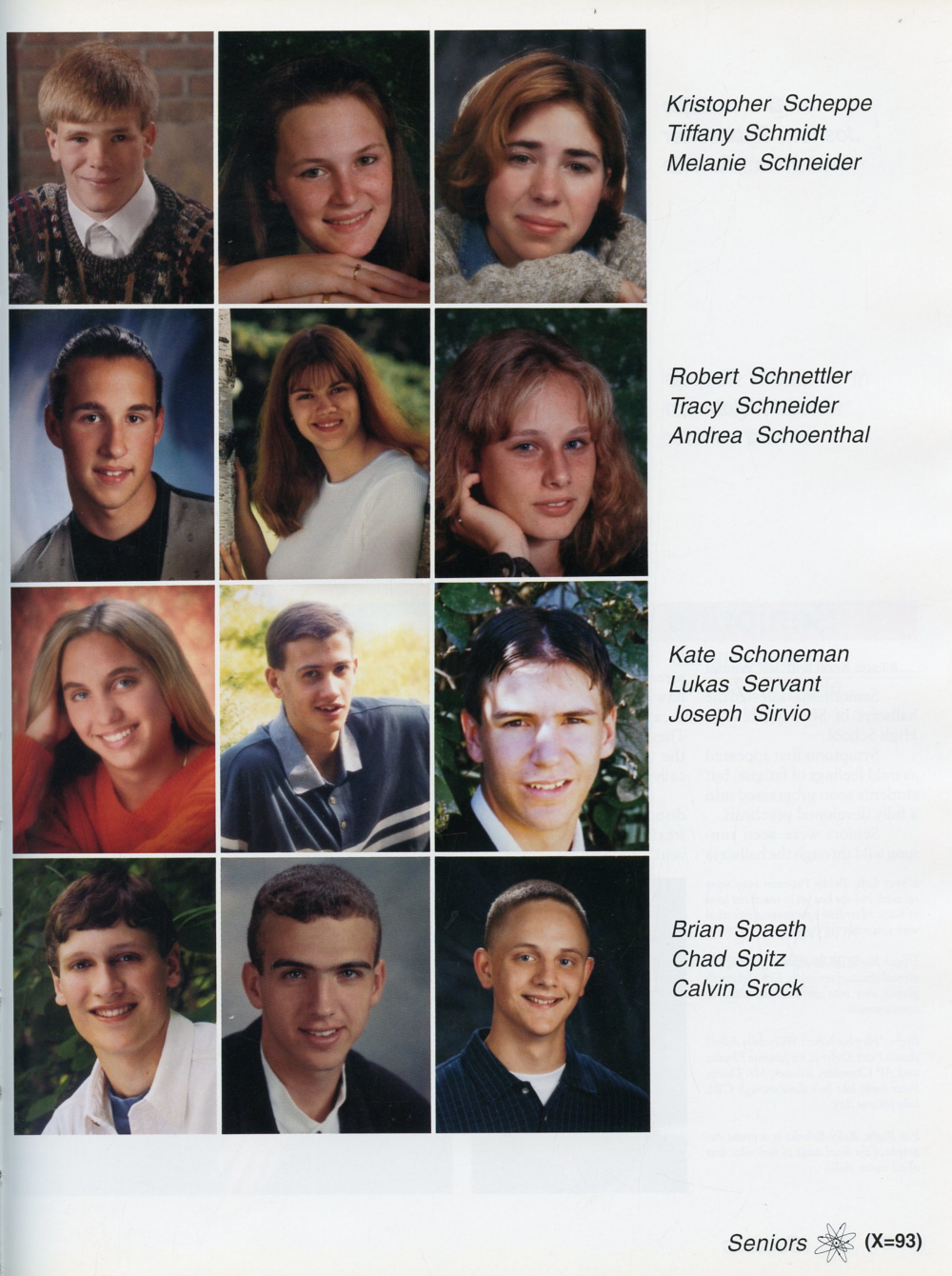 1998 Sheboygan Falls High School Yearbook Page 93: Kristopher Scheppe, Tiffany Schmidt, Melanie Schneider, Robert Schnettler, Tracy Schneider, Andrea Schoenthal, Kate Schoneman, Lukas Servant, Joseph Sirvio, Brian Spaeth, Chad Spitz, Calvin Srock.