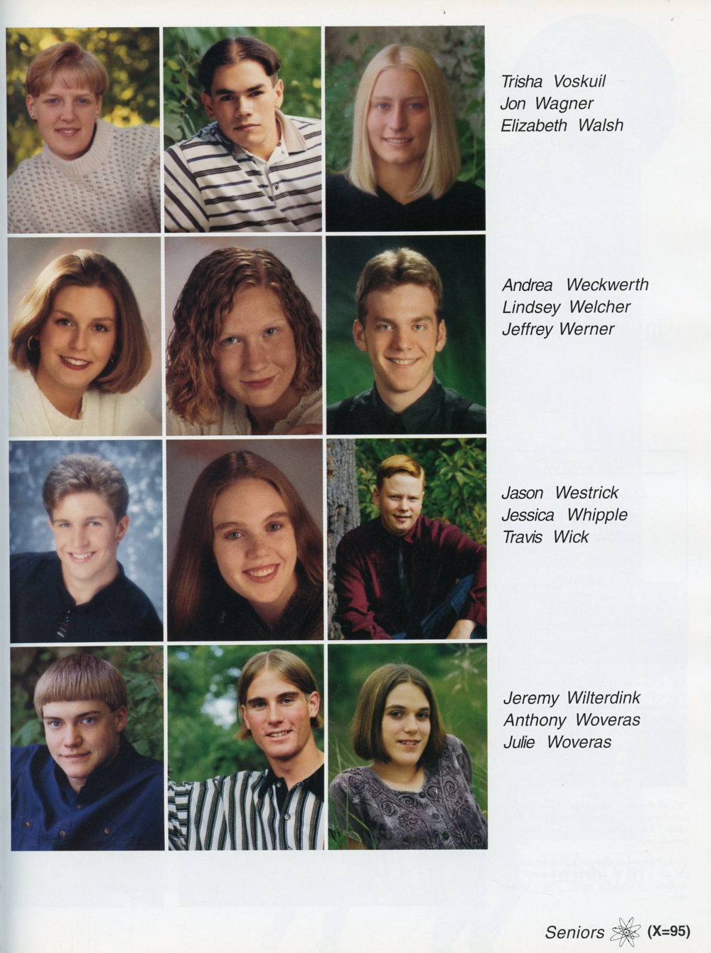 1998 Sheboygan Falls High School Yearbook Page 95: Trisha Voskuil, Jon Wagner, Elizabeth Walsh, Andrea Weckwerth, Lindsey Welcher, Jeffrey Werner, Jason Westrick, Jessica Whipple, Travis Wick, Jeremy Wilderdink, Anthony Woveras, Julie Woveras.