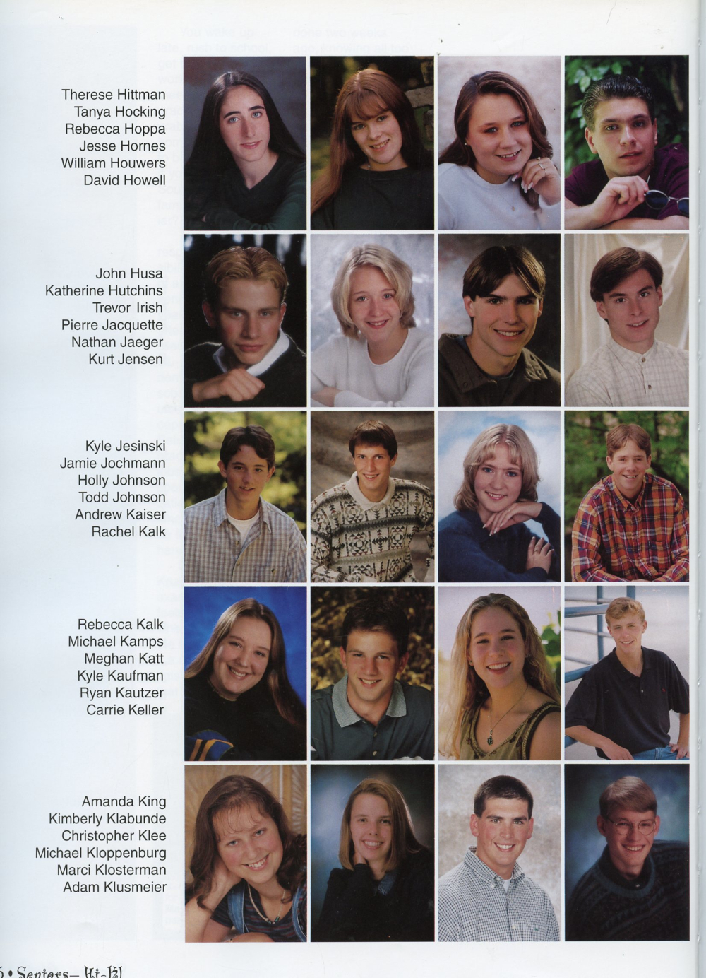 1998 Sheboygan North High School Yearbook Page 106: Therese Hittman, Tanya Hocking, Rebecca Hoppa, Jesse Hornes, John Husa, Katherine Hutchins, Trevor Irish, Pierre Jacquette, Kyle Jesinski, Jamie Jochmann, Holly Johnson, Todd Johnson, Rebecca Kalk, Michael Kamps, Meghan Katt, Kyle Kaufman, Amanda King, Kimberly Klabunde, Christopher Klee, Michael Kloppenburg.