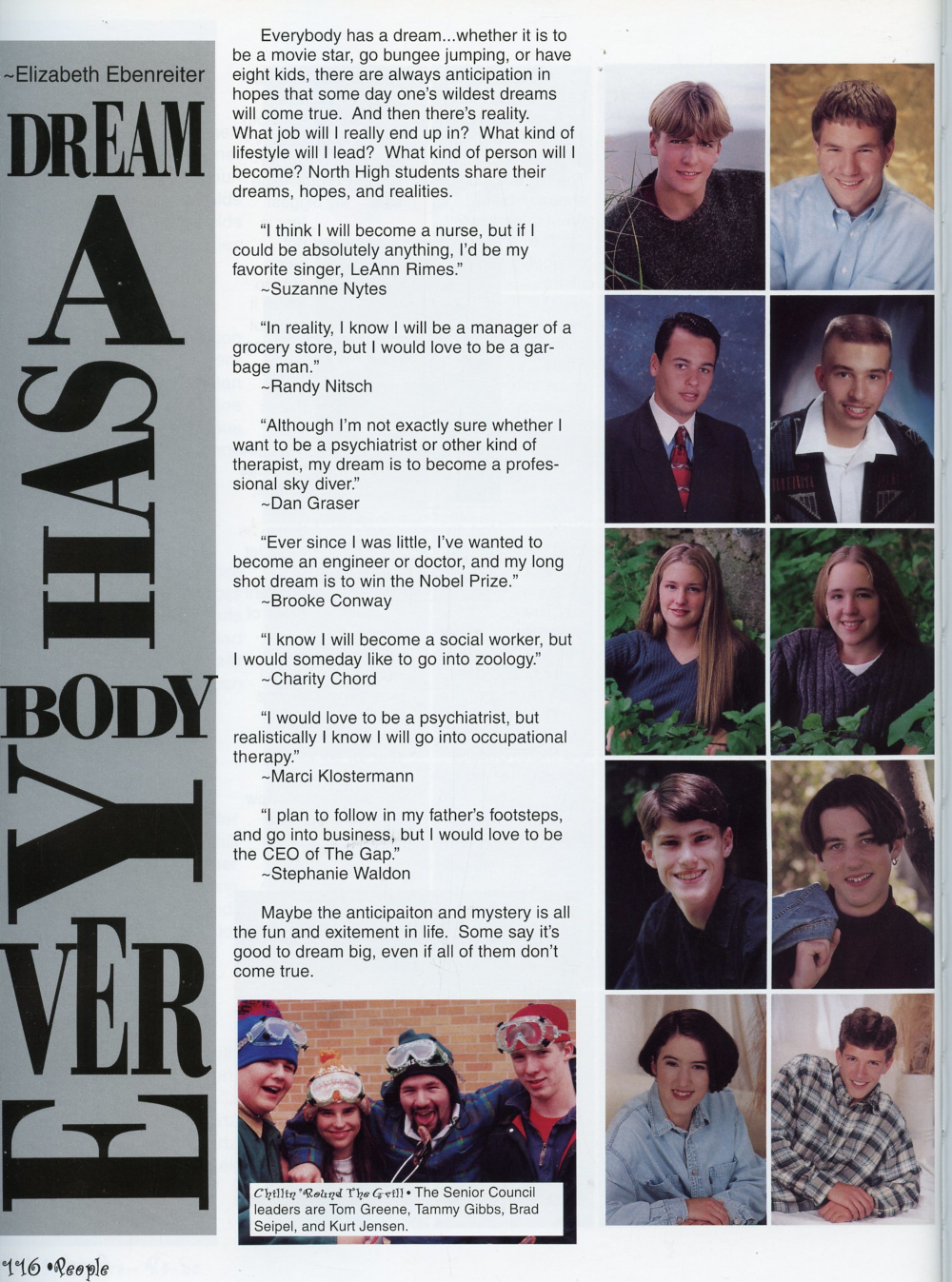 1998 Sheboygan North High School Yearbook Page 116: Dylan Seefeldt, Bradley Seipel, Rodrigo Silva, Eric Simmelink, Ericka Spelshaus, Nicole Spelshaus, Robert Struve, Jurg Stucki, Courtney Tenpas, Adam Teunissen.