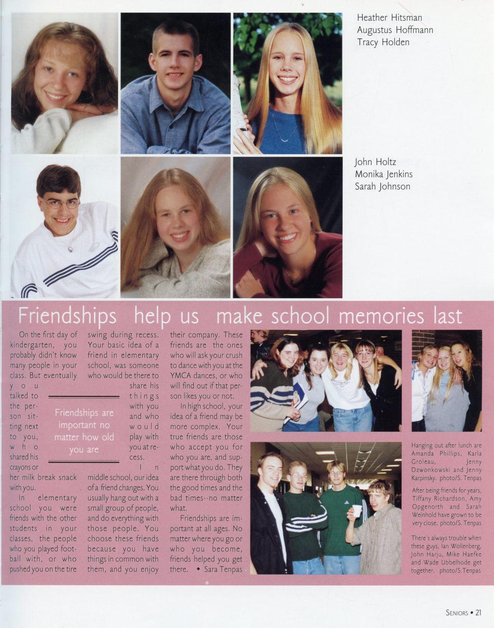 2000 Sheboygan Falls High School Yearbook Page 21: Heather Hitsman, Augustus Hoffmann, Tracy Holden, John Holtz, Monika Jenkins, Sarah Johnson.