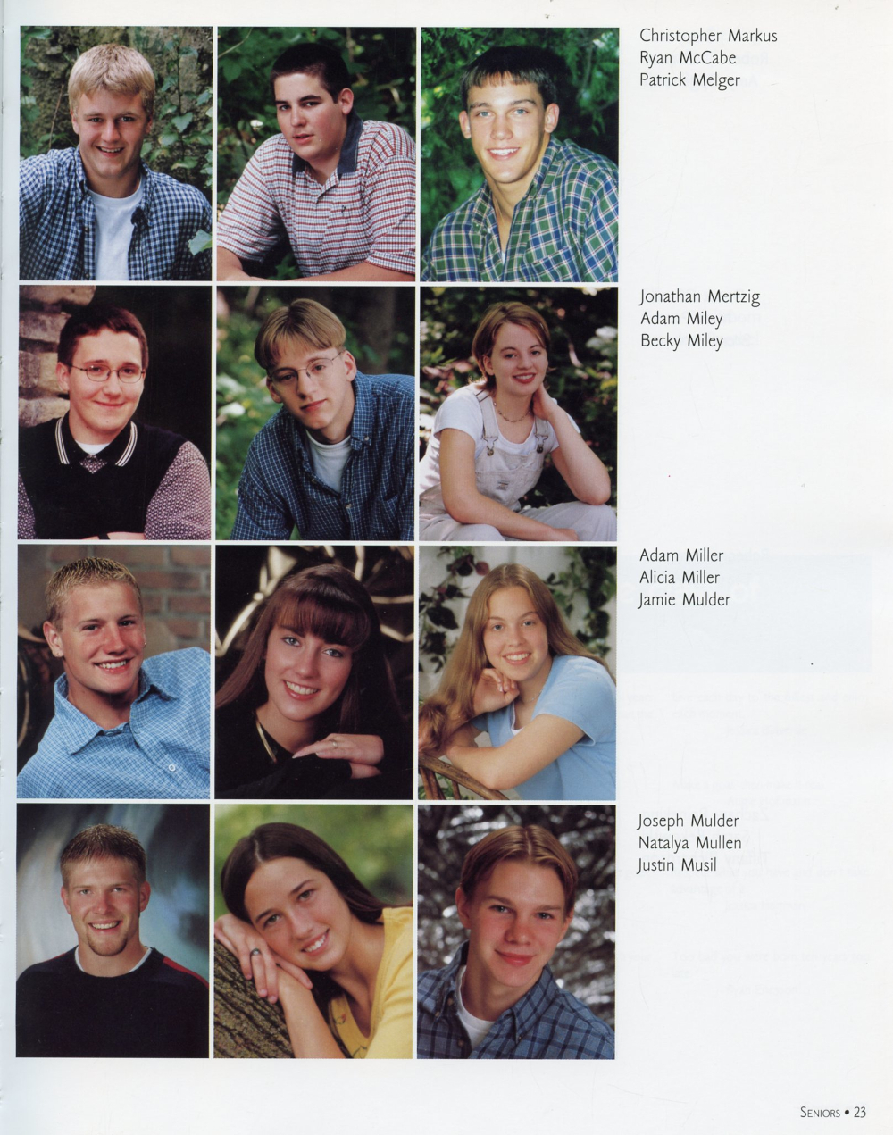 2000 Sheboygan Falls High School Yearbook Page 23: Christopher Markus, Ryan McCabe, Patrick Melger, Jonathan Mertzig, Adam Miley, Becky Miley, Adam Miller, Alicia Miller, Jamie Mulder, Joseph Mulder, Natalya Mullen, Justin Musil.