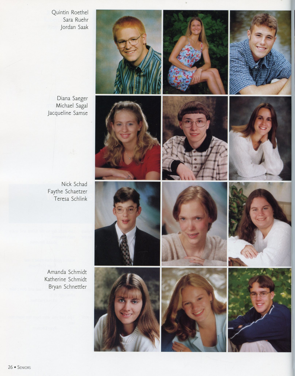 2000 Sheboygan Falls High School Yearbook Page 26: Quintin Roethel, Sara Ruehr, Jordan Saak, Diana Saeger, Michael Sagal, Jacqueline Samse, Nick Schad, Faythe Schaetzer, Teresa Schlink, Amanda Schmidt, Katherine Schmidt, Bryan Schnettler.
