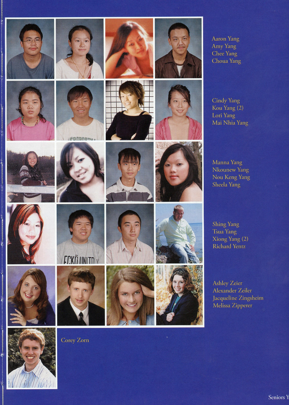 2006 Sheboygan North High School Yearbook Page 137: Aaron Yang, Amy Yang, Chee Yang, Choua Yang, Cindy Yang, Kou Yang, Lori Yang, Mai Nhia Yang, Manna Yang, Nkounew Yang, Nou Keng Yang, Sheela Yang, Shing Yang, Tsua Yang, Xiong Yang, Richard Yentz, Ashley Zeier, Alexander Zeiler, Jacqueline Zingsheim, Melissa Zipperer, Corey Zorn.