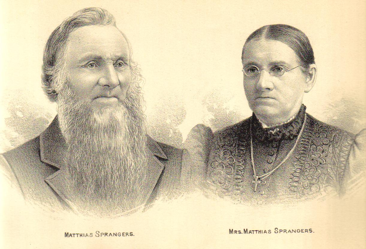 MRS. MATTHIAS SPRANGERS, widow of Matthias Sprangers, is one of the pioneers who are well known to the people of Holland Township. She was born in the city of Arnhem, Guelderland, Holland, September 3, 1831, and is the only surviving member of her father's family, which consisted of two sons and two daughters. Dan Bacot, who was born April 15, 1830, and died May 28, 1893, was for many years a resident of this county. Berdiena is Mrs. Sprangers, who name heads this sketch; Adrian, born May 1, 1829, was a resident of Pine Lake, Mich., where his death occurred November 10, 1884; Maria, born April 23, 1839, became the wife of Fred Hensheller, of Milwaukee, and died October 28, 1892. The father of Mrs. Sprangers, Henry Bacot, was a native of Delft, South Holland, born November 1, 1806, and died in his native land June 14, 1842. Her mother was born September 14, 1810, in Arnhem. After the death of her husband Mrs. Bacot wedded Peter Lizer, who was a native of Heussen, Guelderland, born October 12, 1822. He died in Sheboygan in May, 1878. On the 10th of September, 1846, Mrs. Sprangers accompanied her family to America. It required fifty-five days to make the voyage from Amsterdam to New York, coming on a three-mast sailing-vessel. They made the trip westward by the Hudson River to Albany, thence to Buffalo by rail, where they took a steamer destined for Milwaukee. From the last-named city, Mr. Lizer walked to Sheboygan Falls, in company with a Mr. Van Dune, and each pre-empted a quarter-section of Government land, which was located on section 3, Holland Township. On that Mr. Lizer built his log cabin home and began life in the New World in the true pioneer style. Eighty acres of Mr. Van Dune's original farm are now owned by Mrs. Sprangers. This lady has passed through all the experiences common to the pioneers. On the 30th of May, 1848, she became the wife of Matthias Sprangers, a native of Lage Zwaluwe, North Brabant, Holland, born May 11, 1822. Mr. Sprangers was a twin brother of William Sprangers, a resident of this county. On his birthday in 1847, the former sailed from his native land to the United States, being fifty-five days on the ocean. On the 5th of August of that year, he arrived in Holland Township, where he purchased one hundred and sixty acres of land on section 6. Mr. Sprangers took a prominent part in the early development of Holland Township. A Republican in politics, he was called upon by his townsmen to fill a number of official positions. HE was a member of the Town Board, and also of the County Board of Supervisors for many years. He was the originator of the Town Holland Fire Insurance Company, of which he served as President until his death. On the 9th of August, 1884, he passed from among the living, leaving a name above reproach and a character worthy of emulation. His remains were laid to rest in St. George's Cemetery in Wilson Township. Unto Mr. and Mrs. Sprangers was born a family of thirteen children. Huberdina, born August 9, 1849, is the wife of Henry Benefelt, of Milwaukee; three daughters and a son died in infancy; Henrietta, born August 24, 1857, became the wife of James Lambs, a farmer of the town of Holland; Matthias, born March 20, 1859, is also a farmer of that town; Peter, born March 11, 1862, is a farmer and cheese-maker on the old homestead; William, born December 19, 1864, died April 20, 1882; Catherine, born August 20, 1867, died December 7, 1870; Berdiena, born September 10, 1869, died December 15, 1870; Walter, born December 23, 1871, is a telegraph operator stationed at Elmhurst, Wis.; John, born September 19, 1873, is a student at St. John's University, at Collegeville, Minn. He is a young man of extraordinary ability, as is shown by the fact that in June 1893, he won the gold medal for good conduct and scholarship given by the university in which he is a student. Having resided on the farm until 1883, Mrs. Sprangers removed to Oostburg, where she has a beautiful home. She is an active member in St. George's Catholic Church, as was also her esteemed husband. Mrs. Sprangers is one of the few remaining pioneers of Holland Township, where she has made her home for over forty-six years.